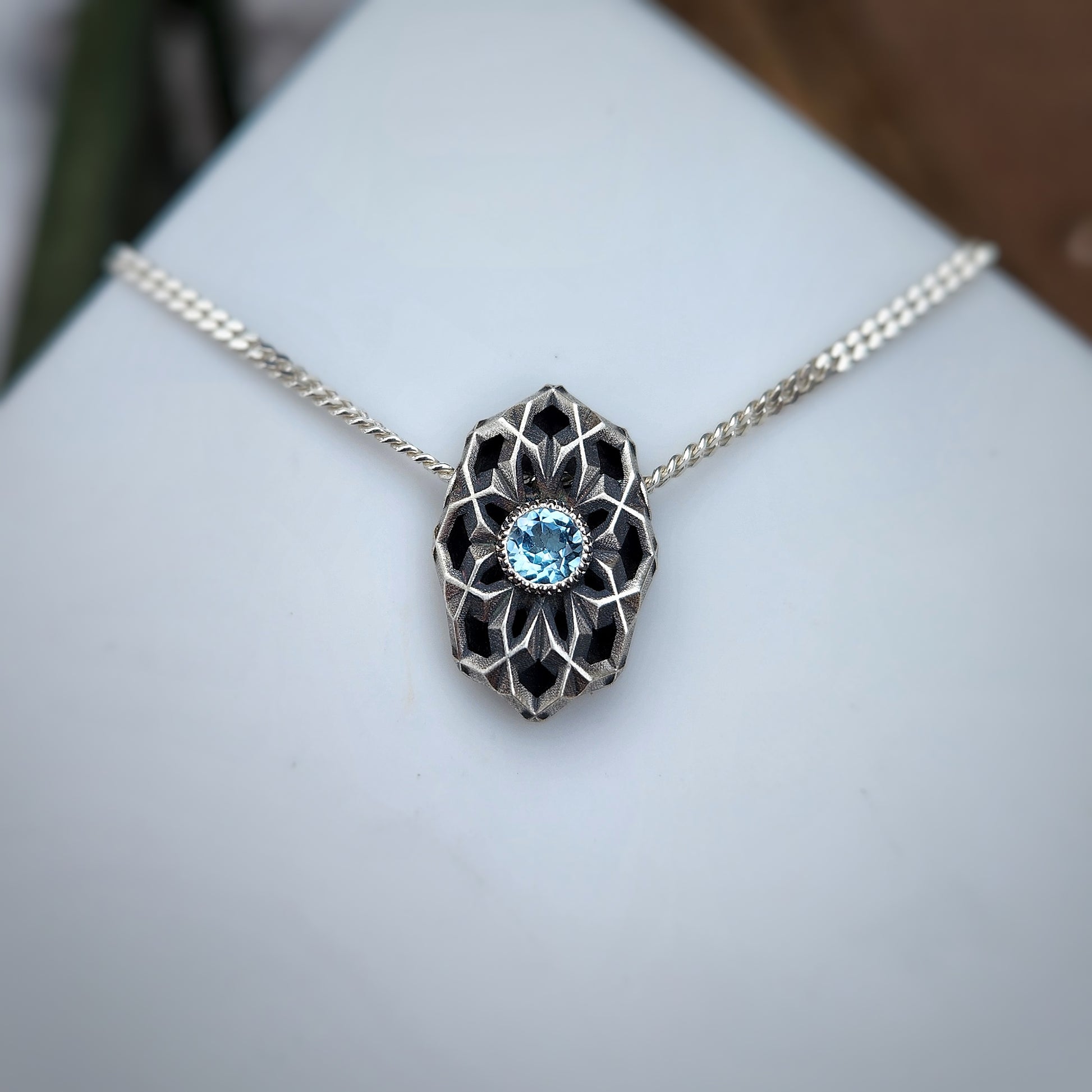 This handcrafted sterling silver pendant features a striking geometric design with intricate openwork detailing, creating a bold and timeless look. The center stone is securely set to highlight its brilliance, while the antiqued brush finish enhances the depth and contrast of the design. The pendant is designed with a slide-through for the chain, ensuring a seamless and elegant presentation. Perfect for anyone who values unique craftsmanship and modern artistry.