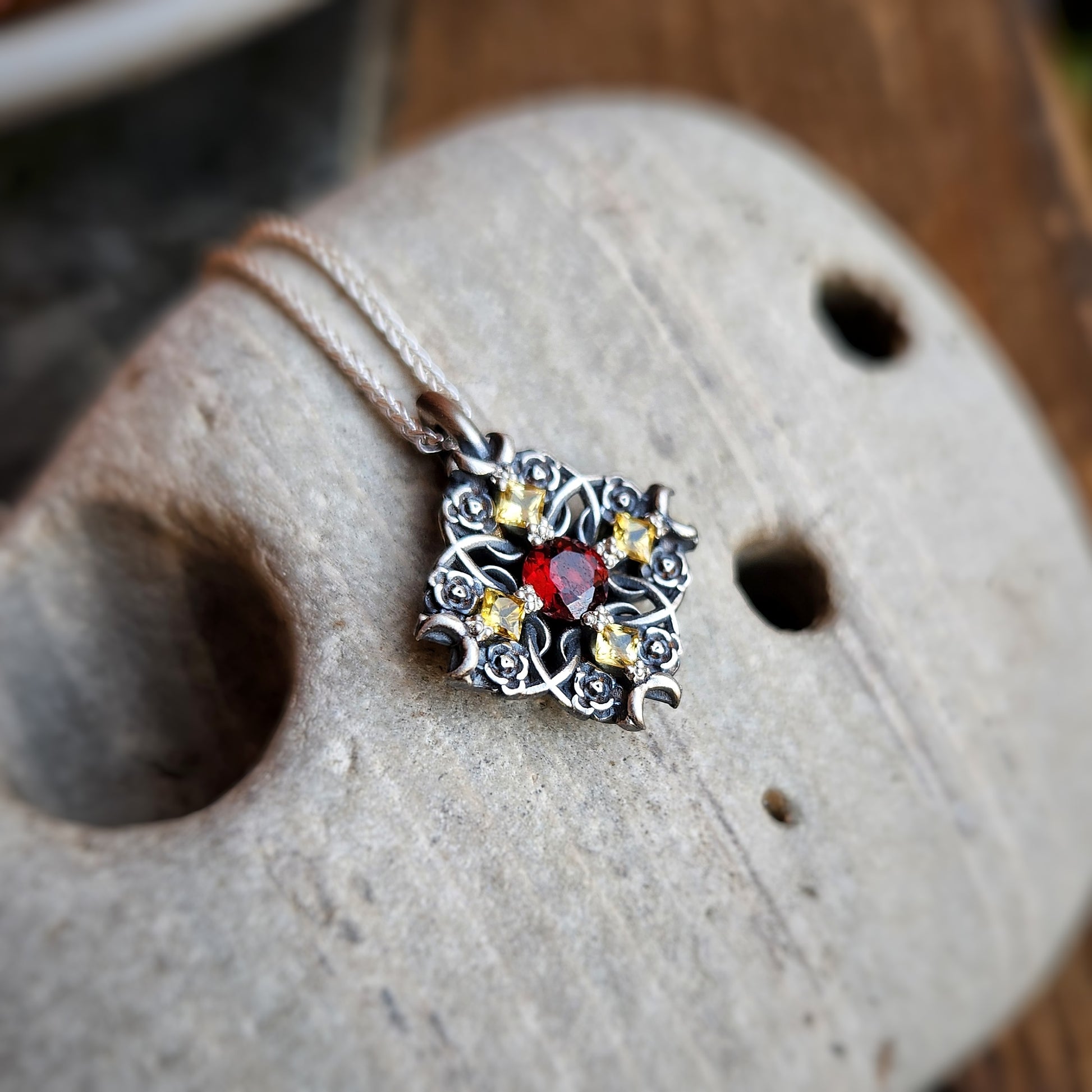 This striking geometric pendant features a deep red garnet at its center, exuding rich elegance. Surrounding the garnet are four princess-cut yellow sapphires, their cool hues adding a vibrant contrast. Delicate floral-inspired accents frame the stones, blending the sharp geometry with graceful botanical curves. Perfectly balanced, this pendant captures both bold symmetry and the organic beauty of nature, making it a unique and captivating statement piece.