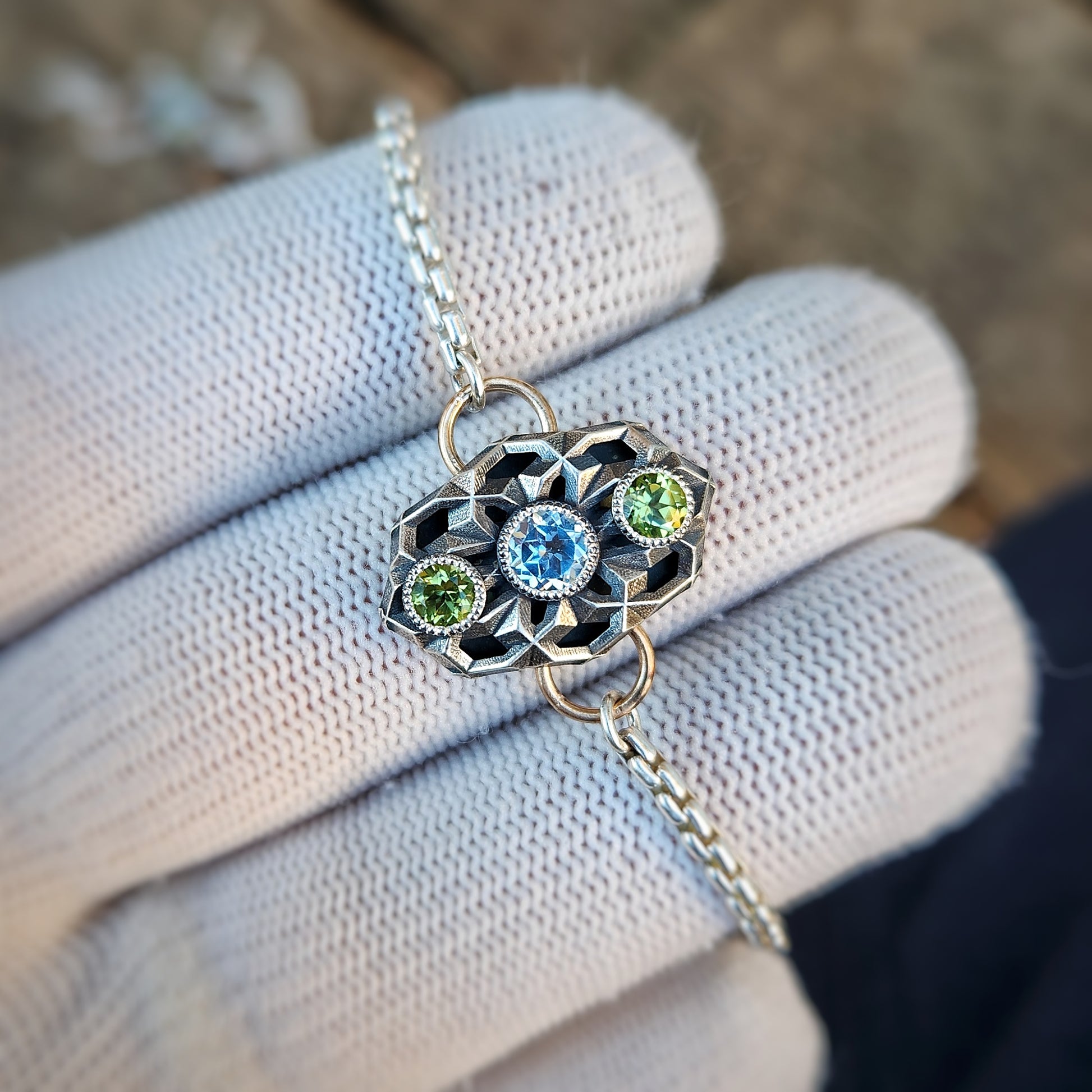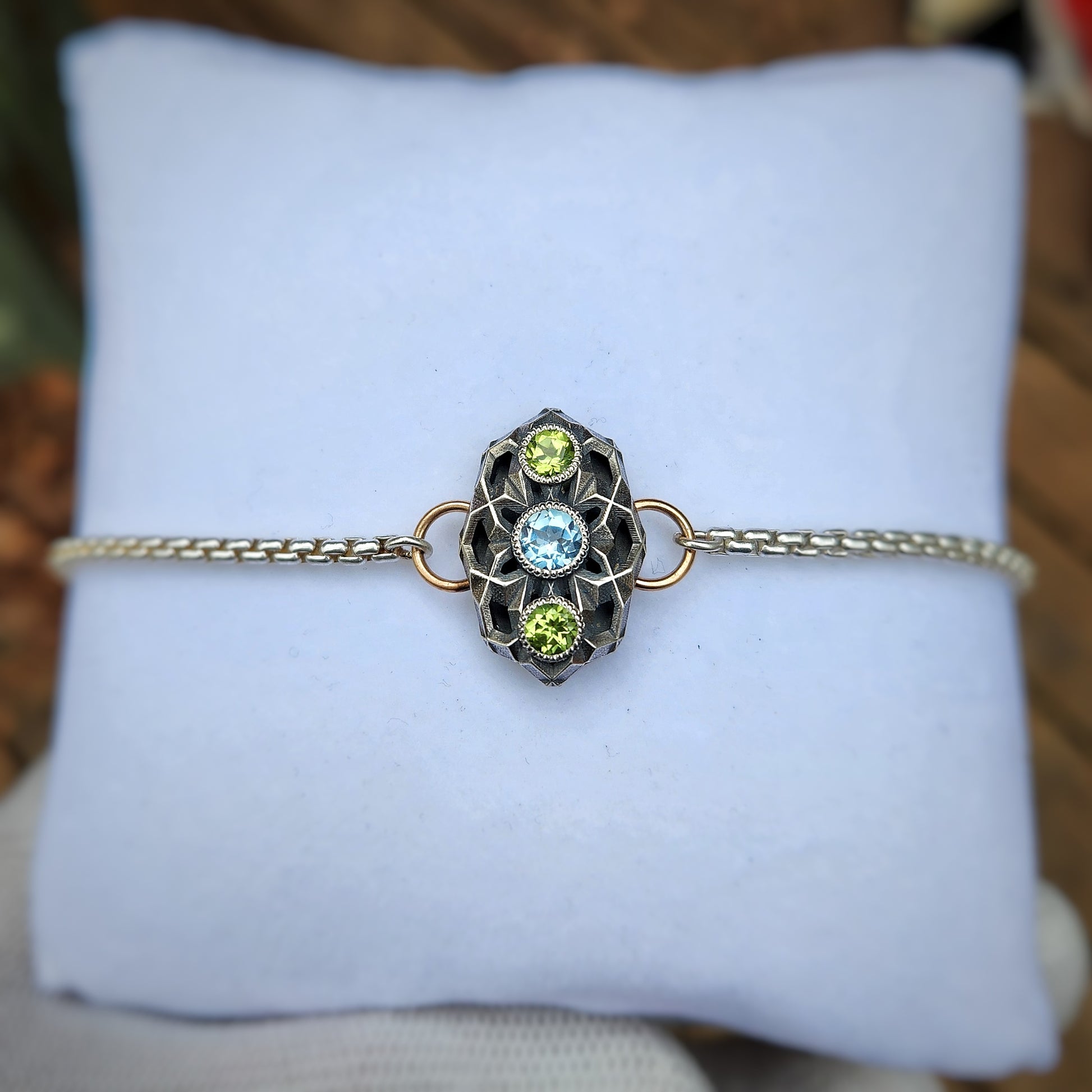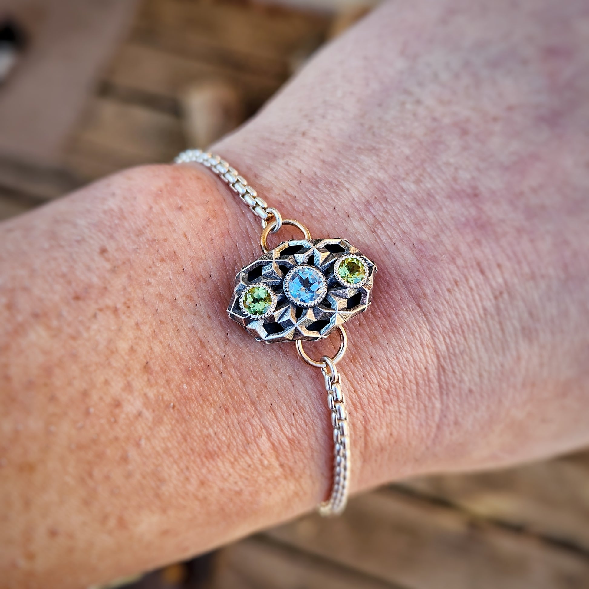 This bracelet features an intricately designed sterling silver centerpiece with a geometric pattern enhanced by an antiqued, brush finish. At the heart of the design is a vibrant blue topaz, accented by two lively green peridot gemstones on either side. The silver chain connects seamlessly to the centerpiece with bronze jump rings, creating a beautiful mixed-metal aesthetic. Elegant and striking, this bracelet is a perfect blend of craftsmanship and artistic detail, ideal for everyday wear or special occasions.