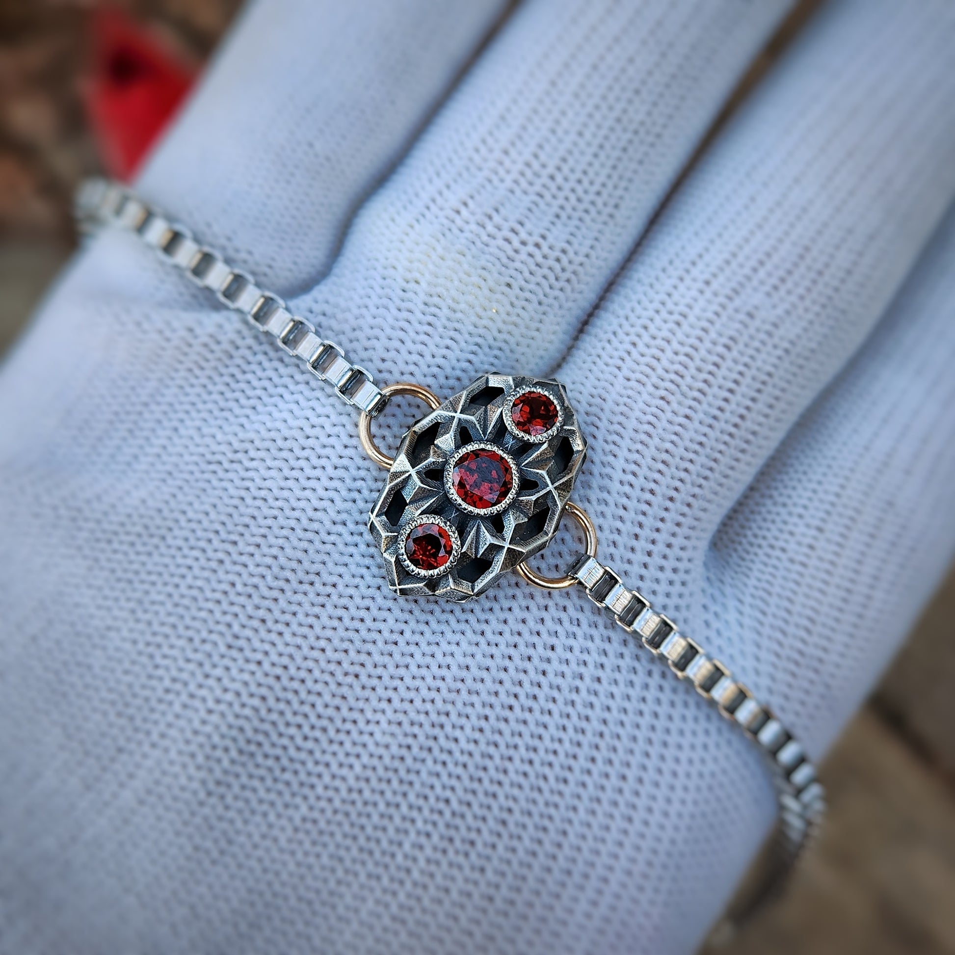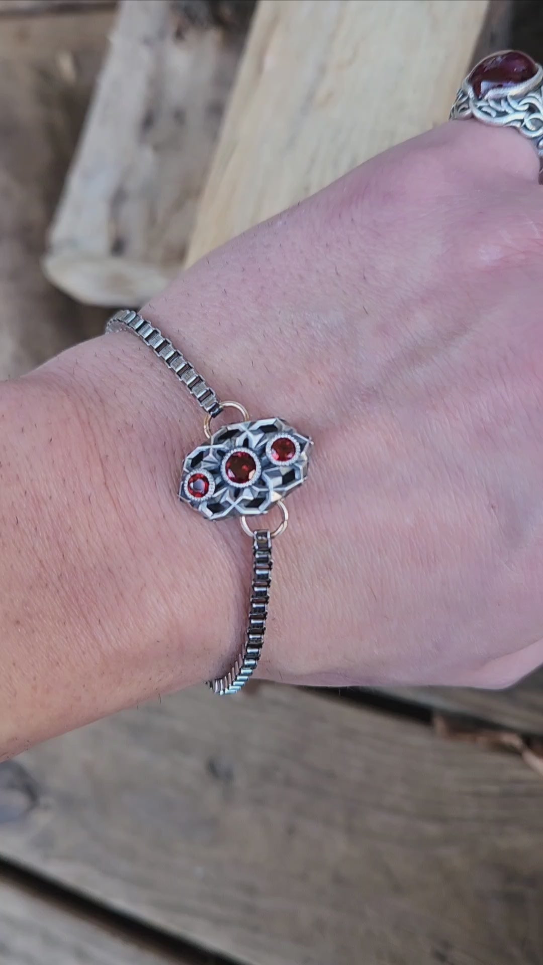 This bracelet features an intricately designed sterling silver centerpiece with a geometric pattern enhanced by an antiqued, brush finish. At the heart of the design is a vibrant red garnet, accented by two lively red garnet gemstones on either side. The stainless steel chain connects seamlessly to the centerpiece with bronze jump rings, creating a beautiful mixed-metal aesthetic. Elegant and striking, this bracelet is a perfect blend of craftsmanship and artistic detail, ideal for everyday wear or special occasions.