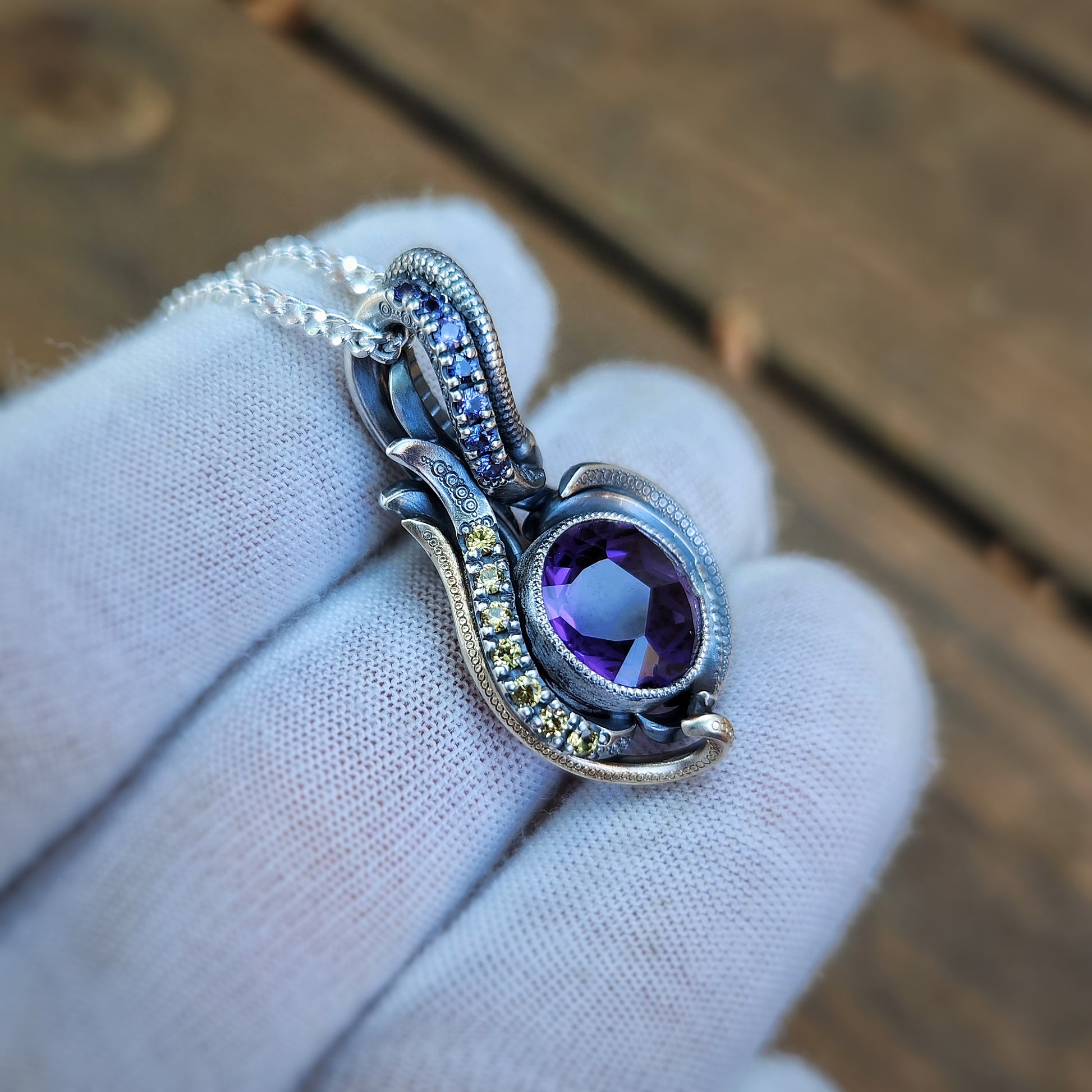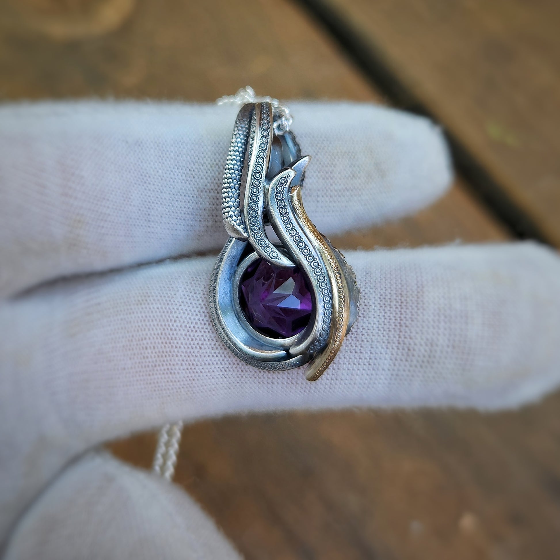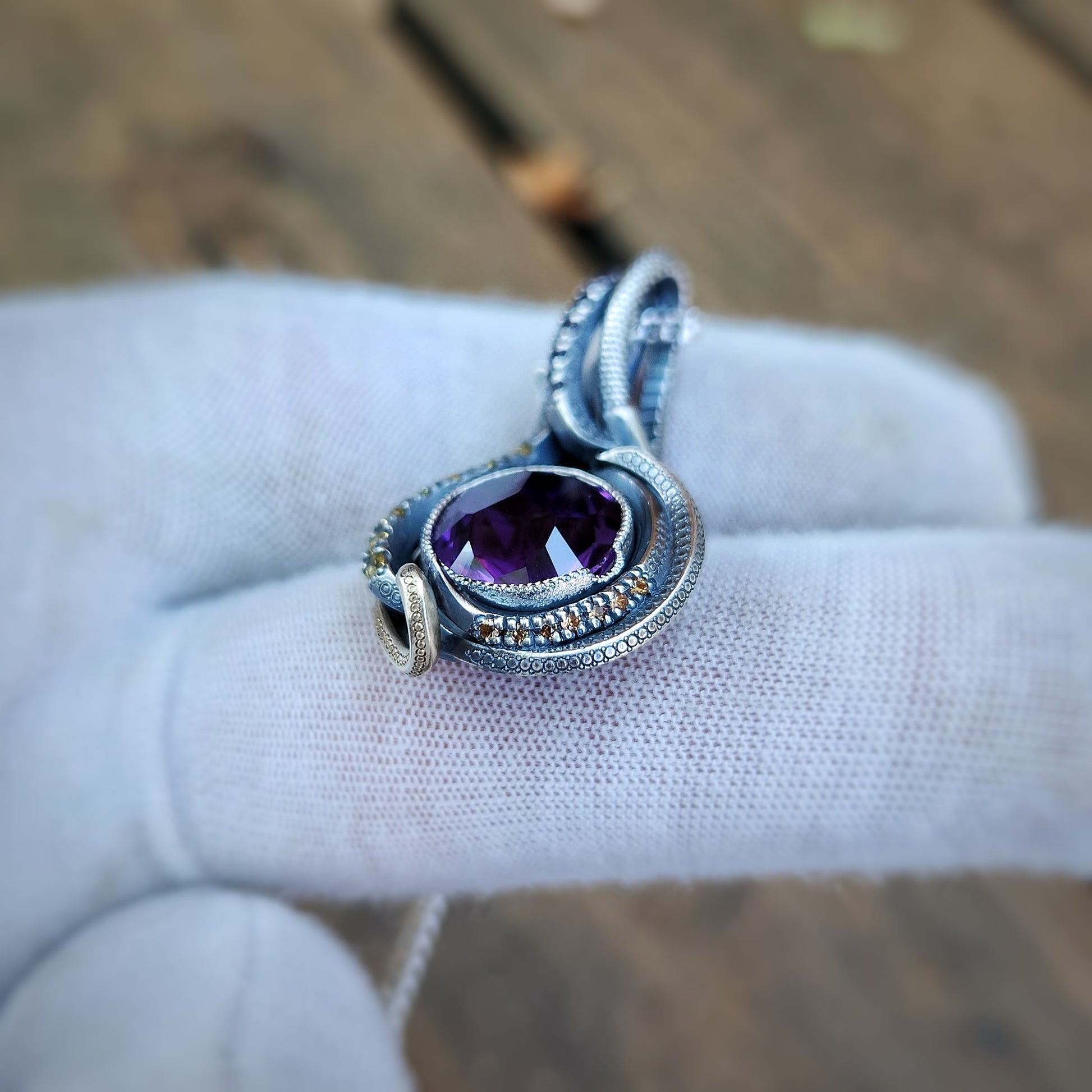 This one-of-a-kind pendant showcases a custom-cut amethyst at its heart, radiating deep violet fire. The center stone is embraced by flowing forms of antiqued sterling silver, hand-detailed with intricate textures and sculptural curves that invite exploration from every angle.
