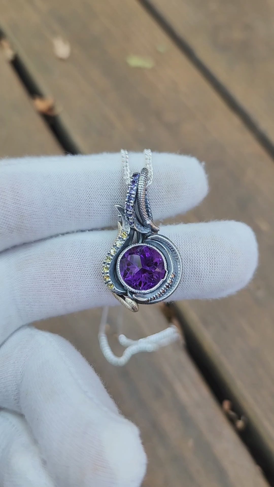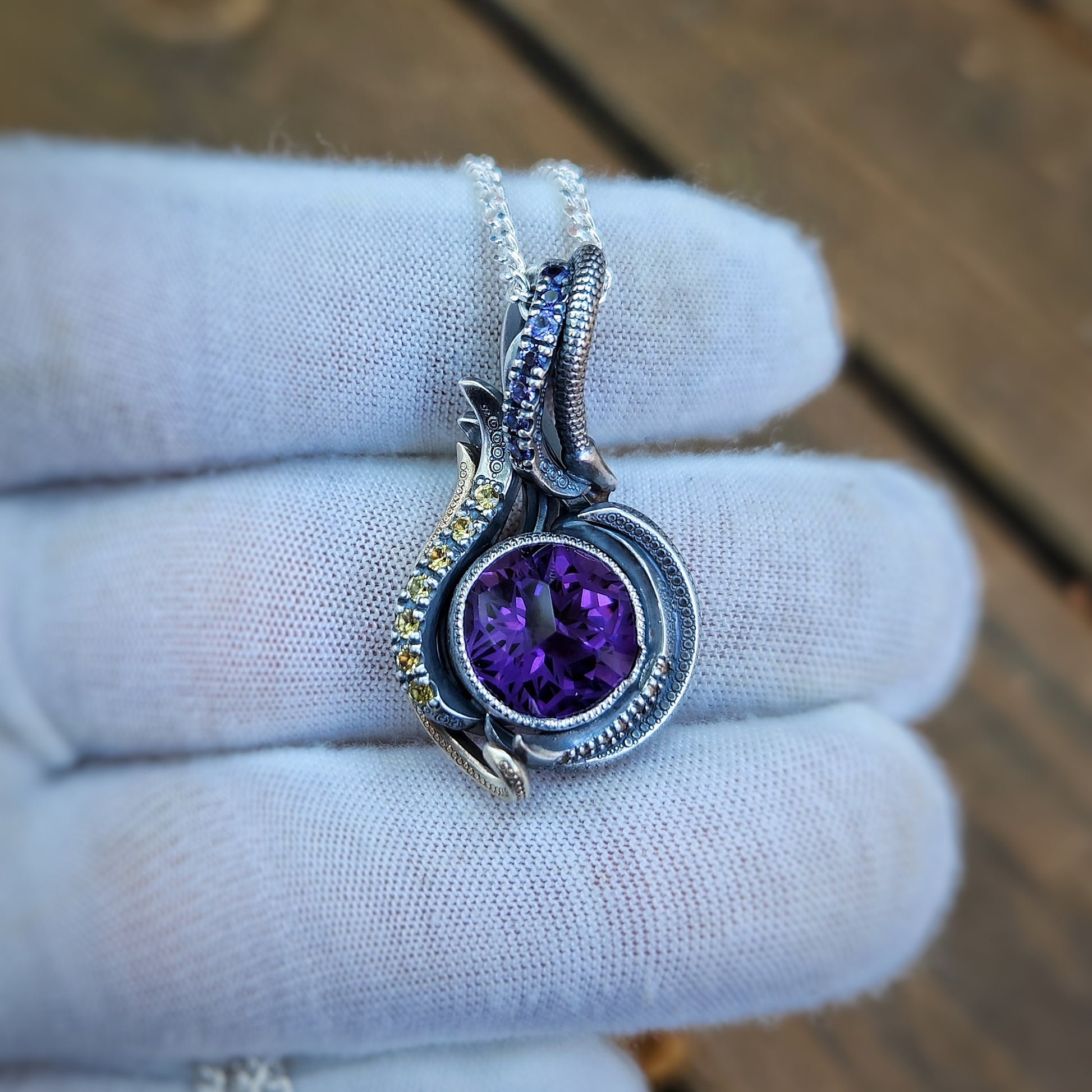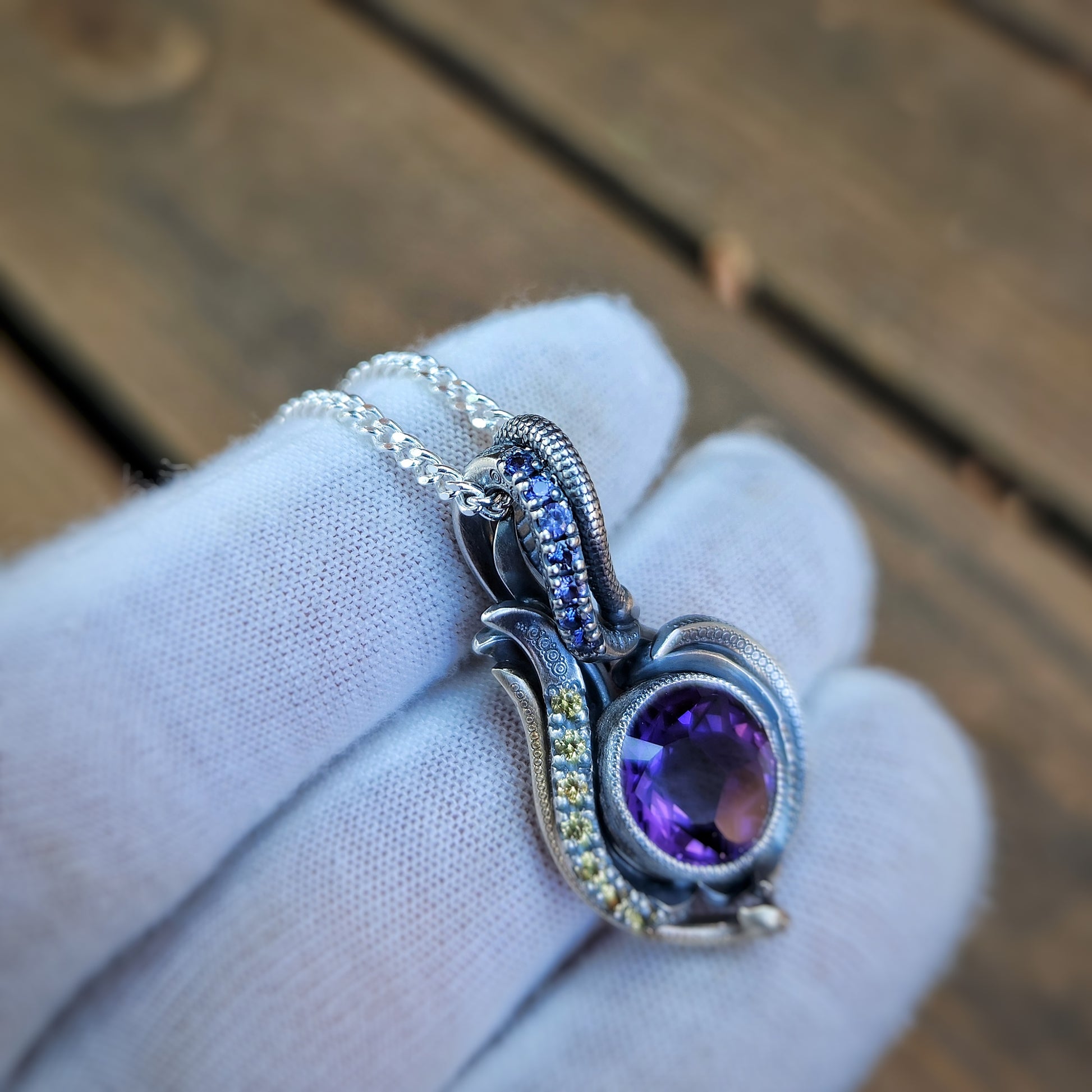 This one-of-a-kind pendant showcases a custom-cut amethyst at its heart, radiating deep violet fire. The center stone is embraced by flowing forms of antiqued sterling silver, hand-detailed with intricate textures and sculptural curves that invite exploration from every angle.