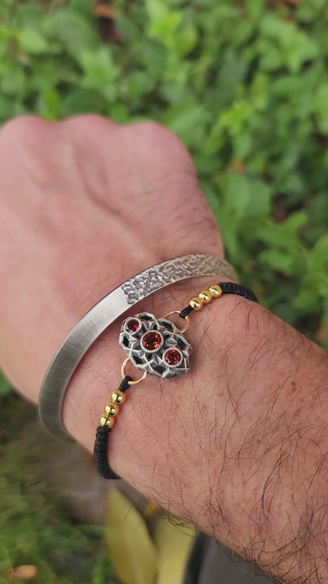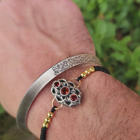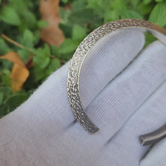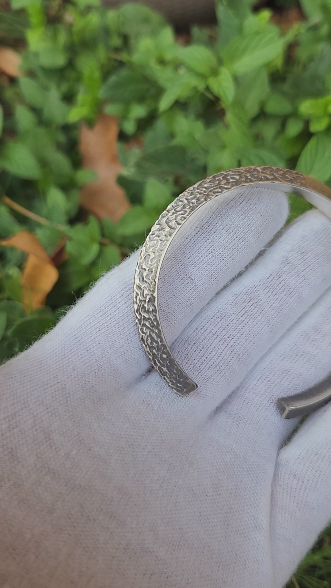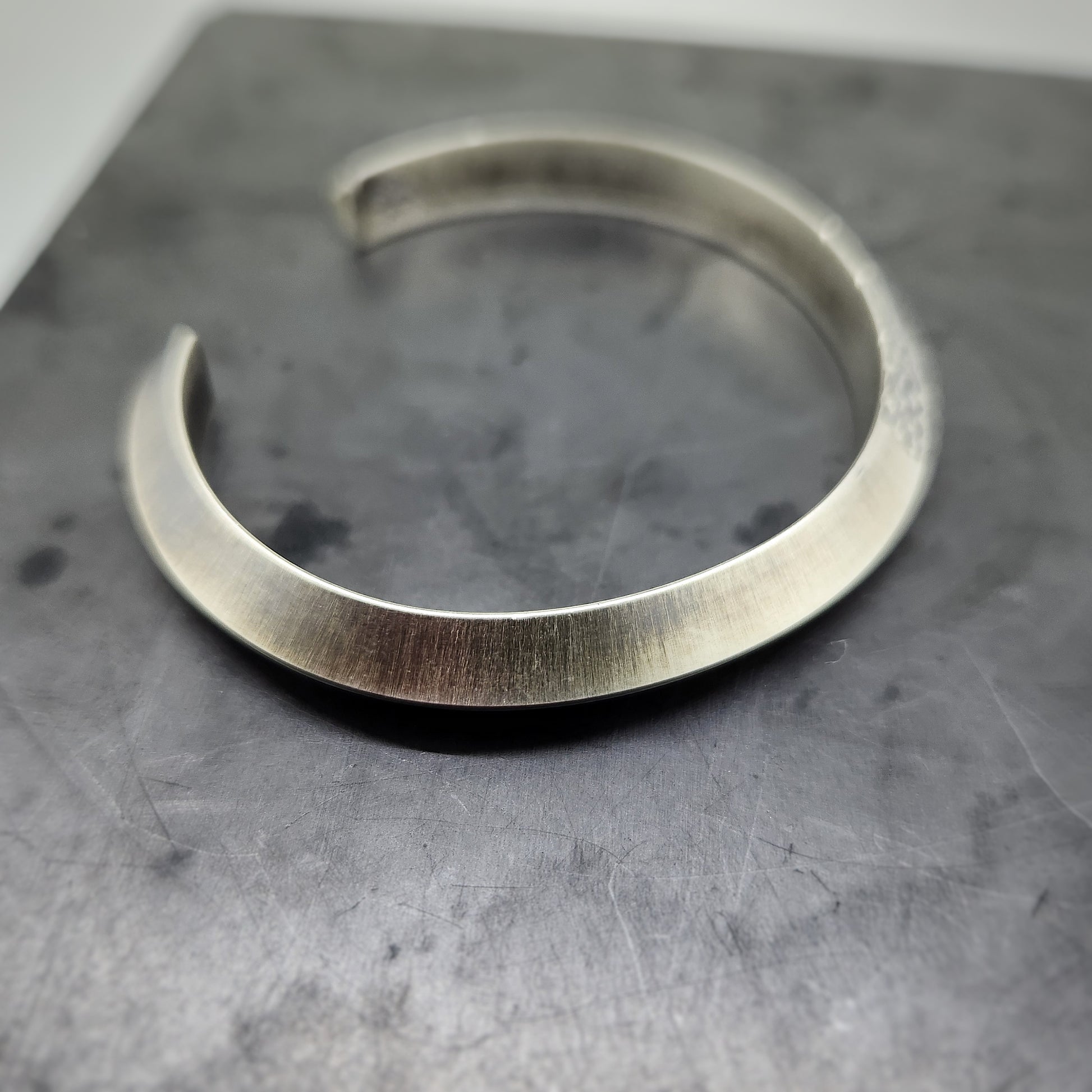 Crafted by hand from solid sterling silver, this bangle features a hand-engraved textured, brush finished surface that gives it a rugged yet refined look. The piece is shaped and finished individually, offering a natural variation that highlights its handmade character. The opening measures approximately 1", and the bangle fits comfortably on a 7¾" wrist. Like all silver bangles, it can be gently flexed to adjust for a slightly tighter or looser fit. Durable, timeless, and meant for everyday wear.