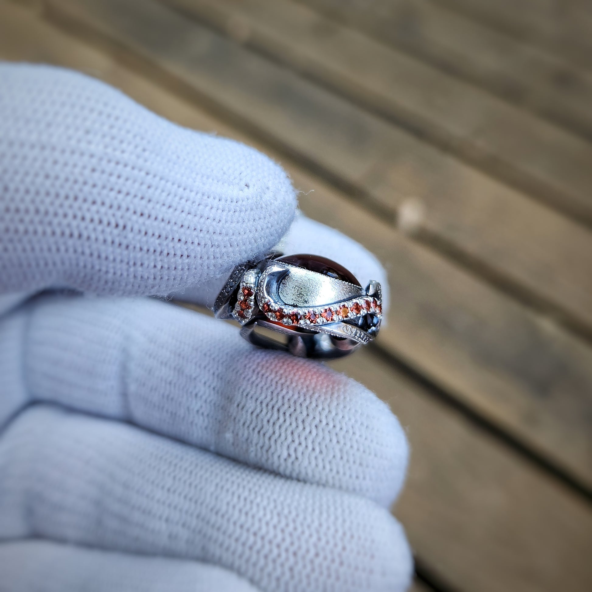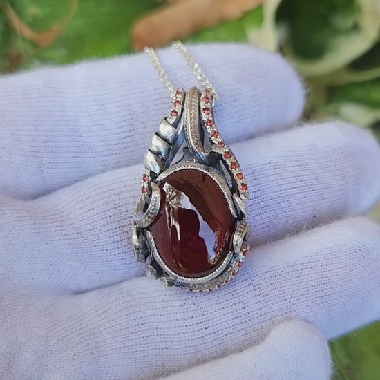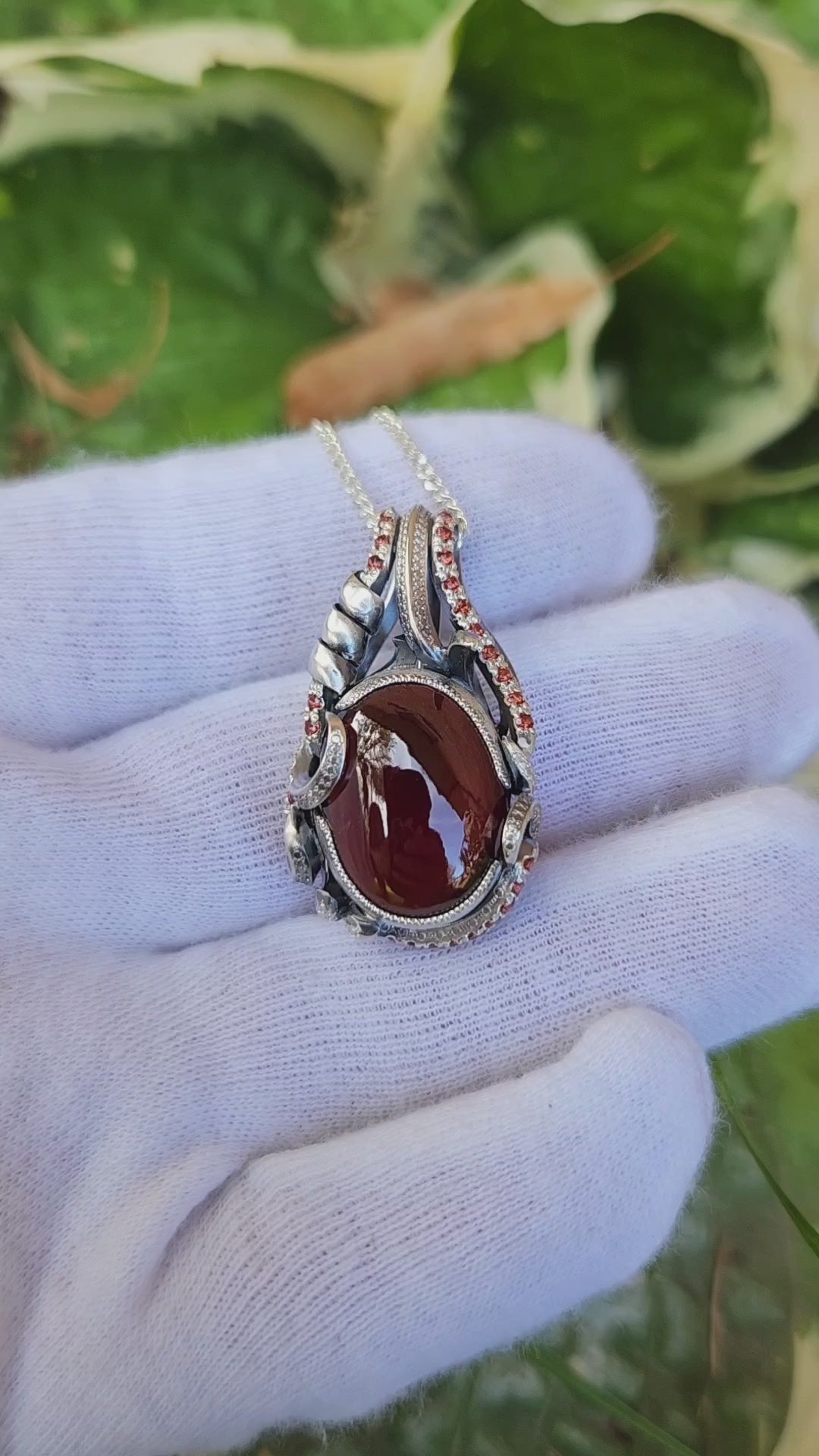 Handmade and hand-forged in sterling silver, this pendant features a striking red-orange hessonite garnet cabochon as its centerpiece. Burnt orange garnet accents complement the main stone, adding depth and warmth to the design. Each surface has been hand-detailed with 360° craftsmanship, ensuring visual interest from every angle.