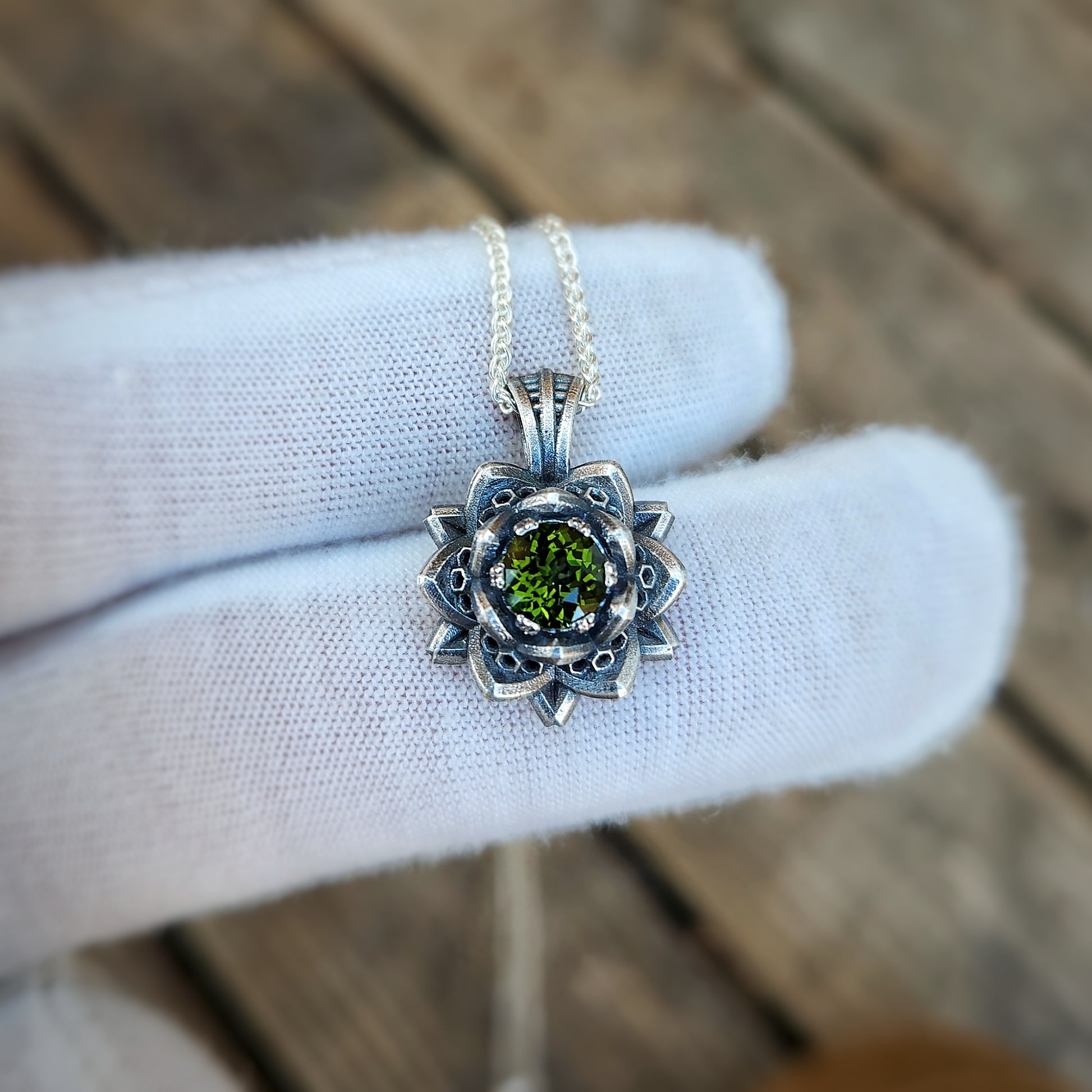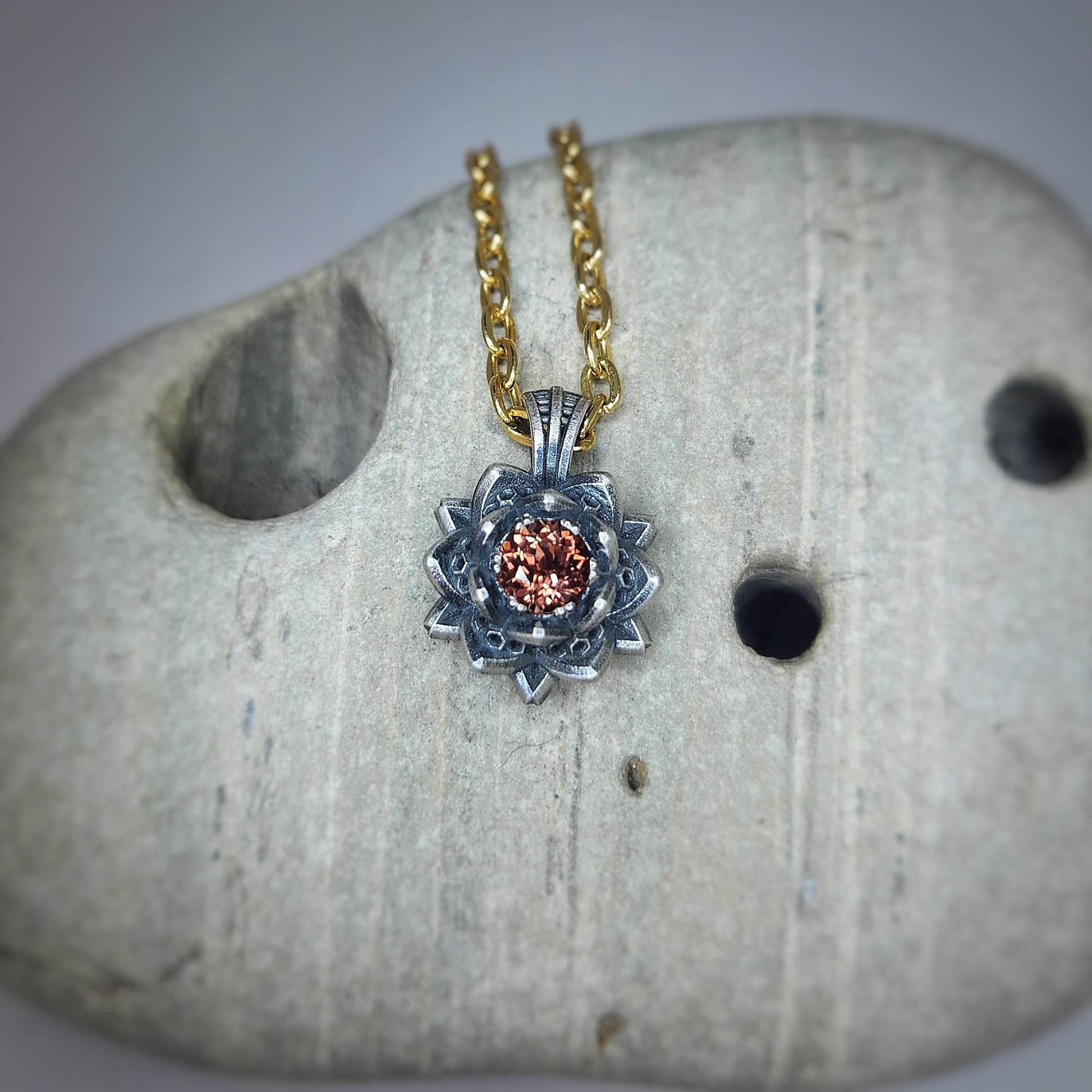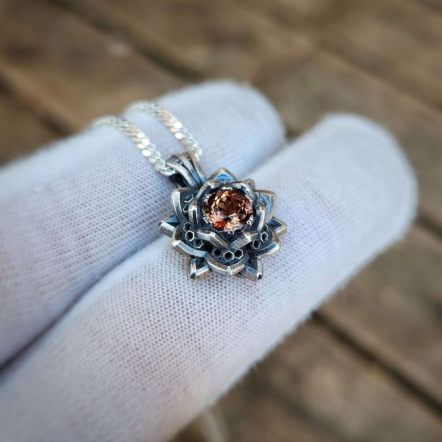 This stunning pendant, crafted in sterling silver, features an intricate design of futuristic Lotus flowers. The petals elegantly intertwine, creating a unique and modern aesthetic. These Lotus flowers is adorned with: An eye clean peachy/orange Tourmaline.
