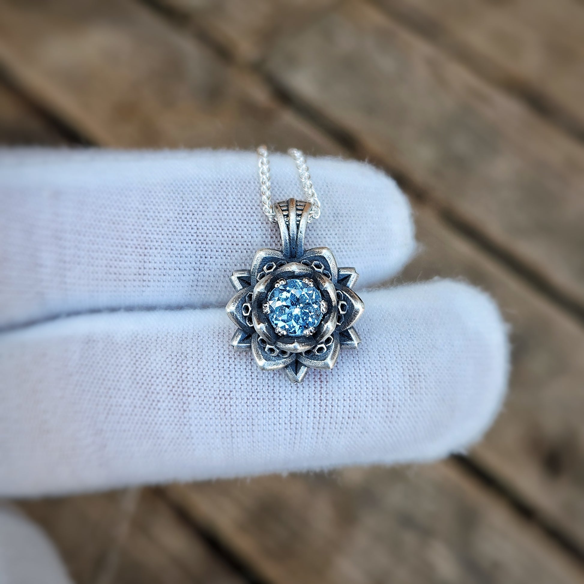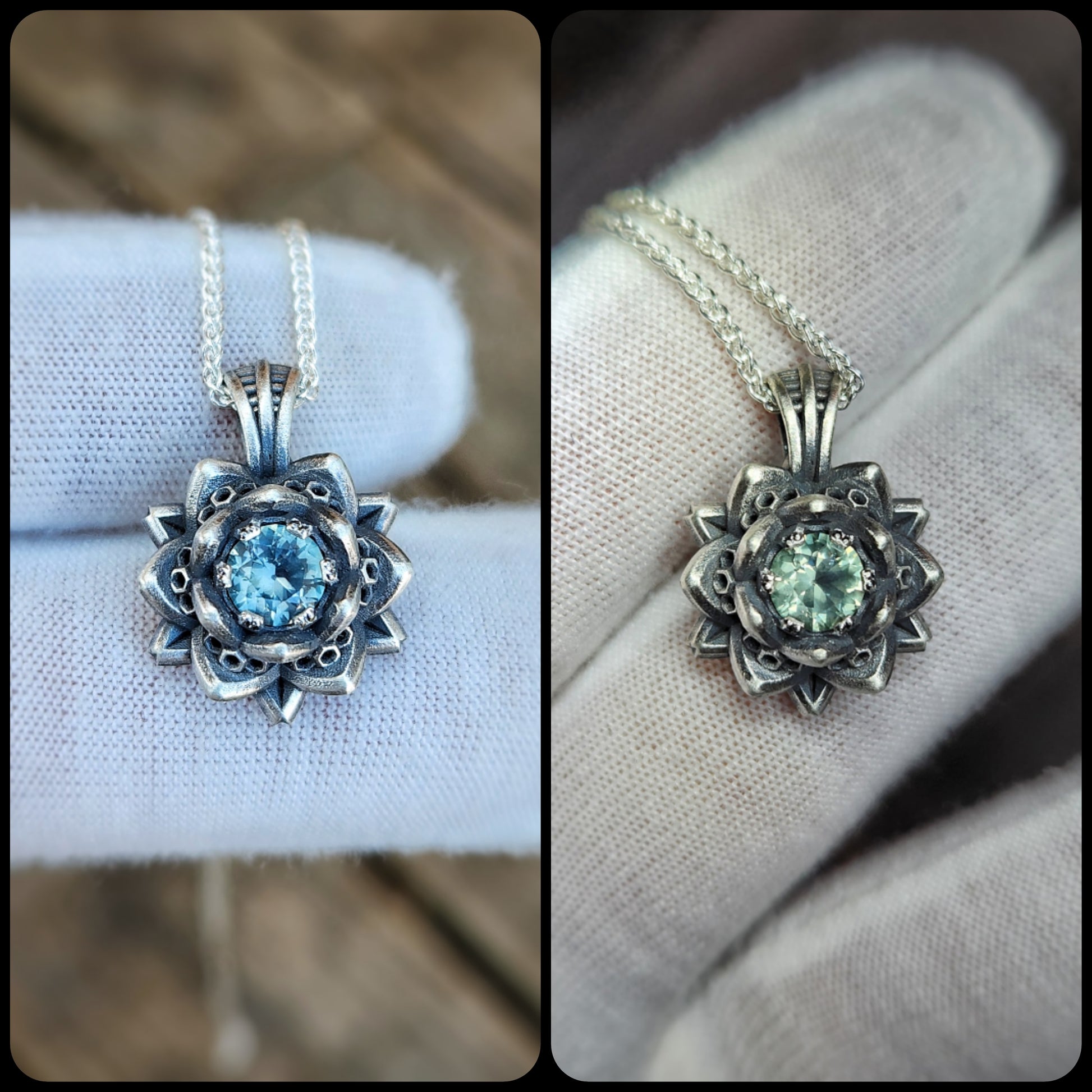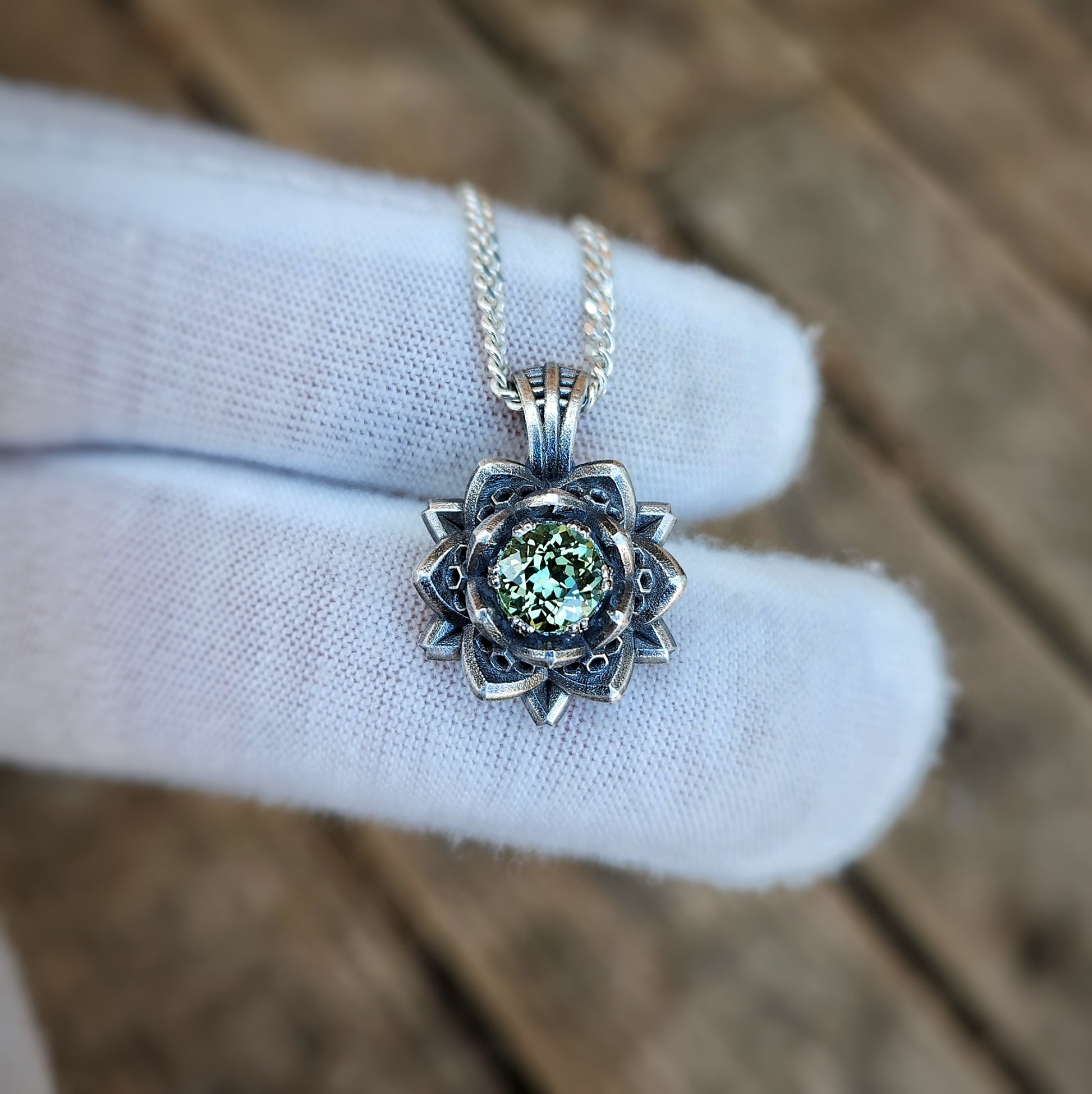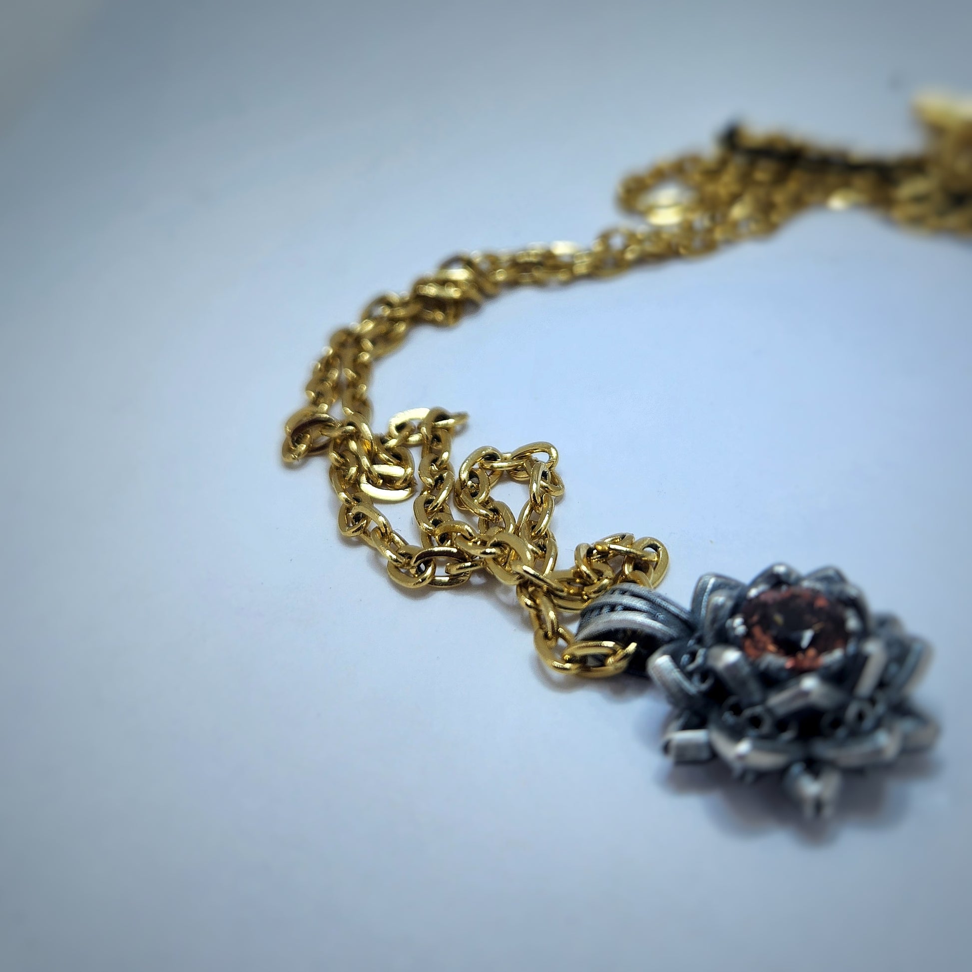 This stunning pendant, crafted in sterling silver, features an intricate design of futuristic Lotus flowers. The petals elegantly intertwine, creating a unique and modern aesthetic. These Lotus flowers is adorned with: An eye clean peachy/orange Tourmaline.