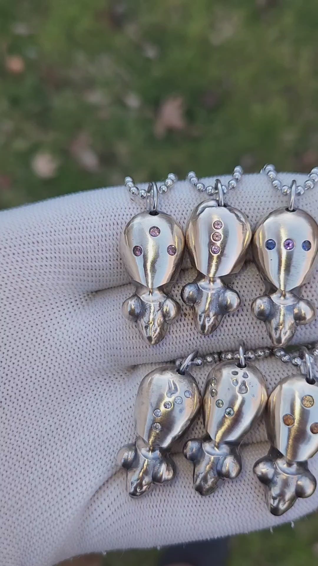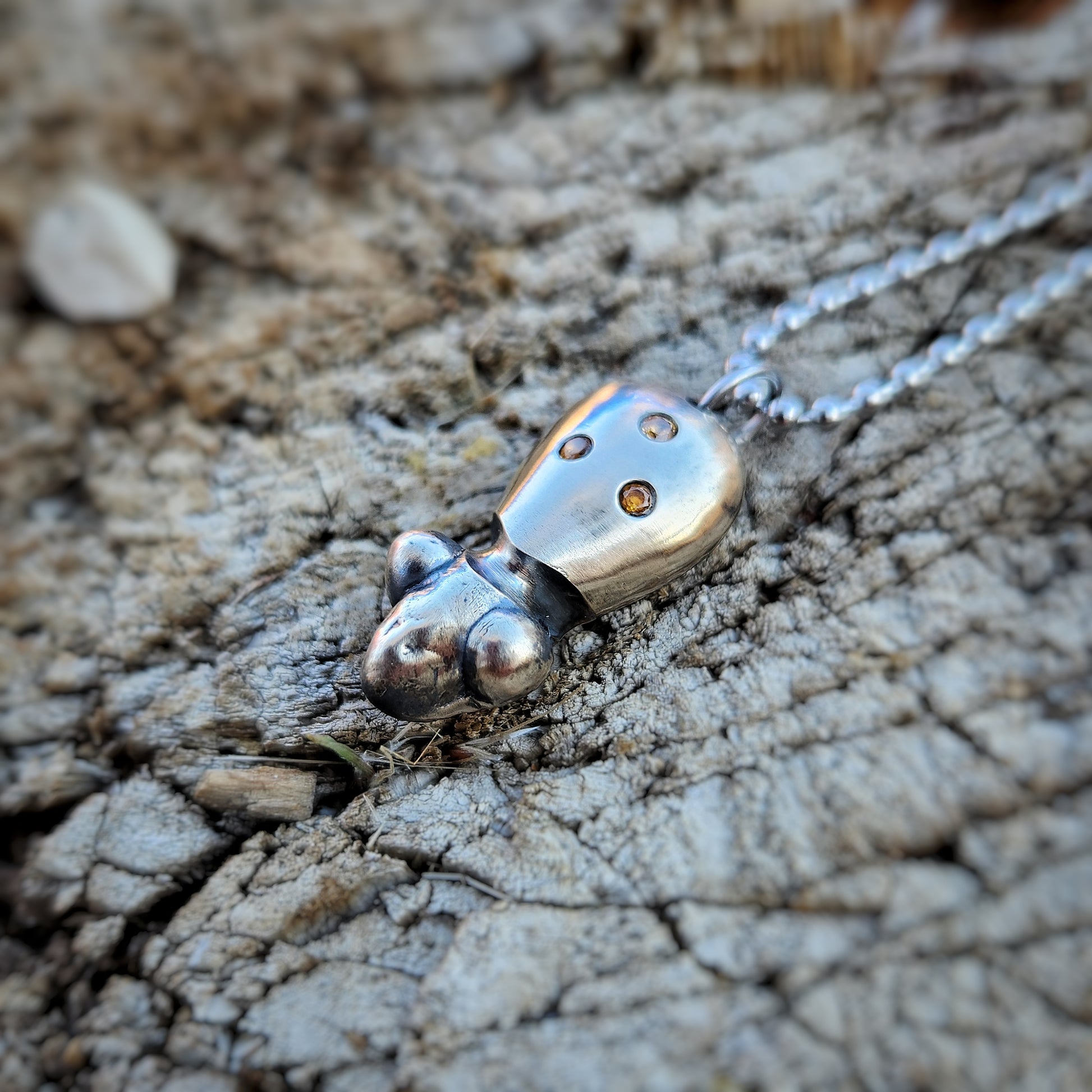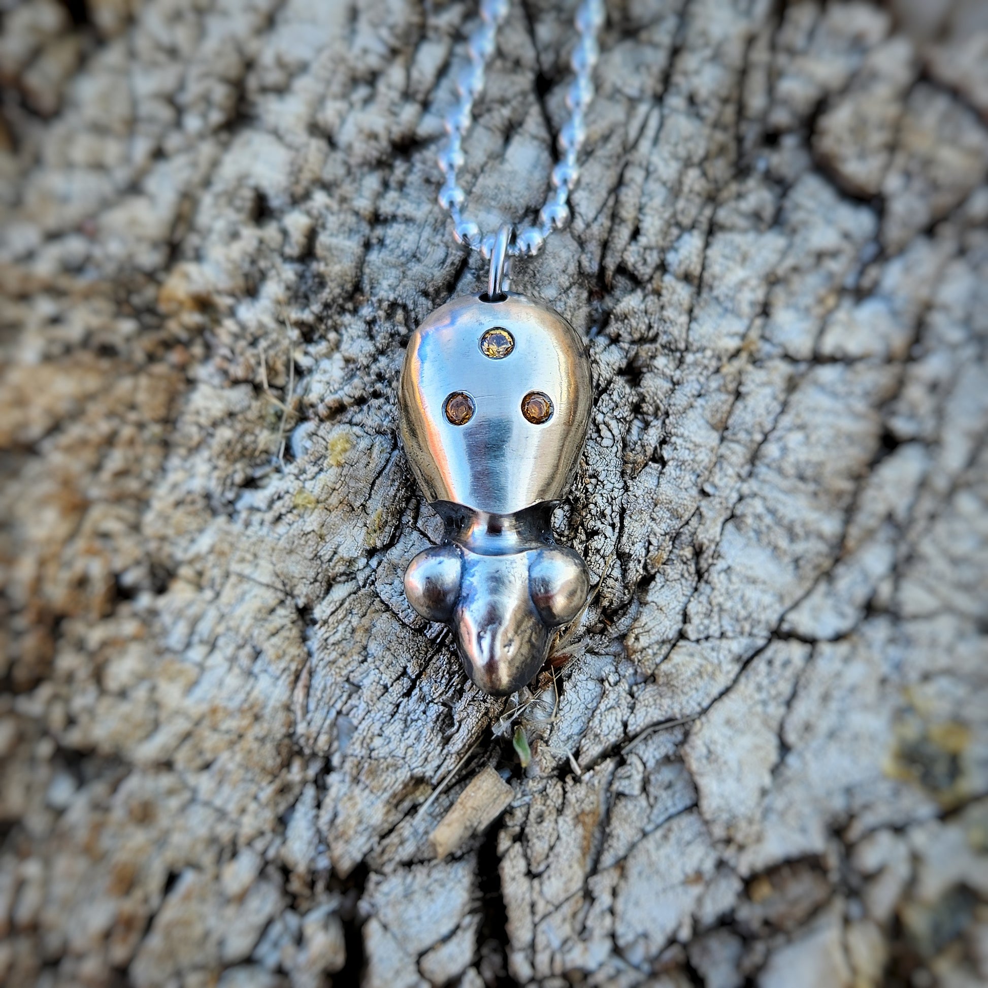 A small, hand-poured Visitor crafted from Ben’s secret metal mix — no two are the same. Each piece is set with hand-picked gemstones and brush finished to show the metal’s natural depth and patina. Worn on a short chain or added to a charm cluster, this Visitor is a tiny companion with a particular piece of wisdom to share.