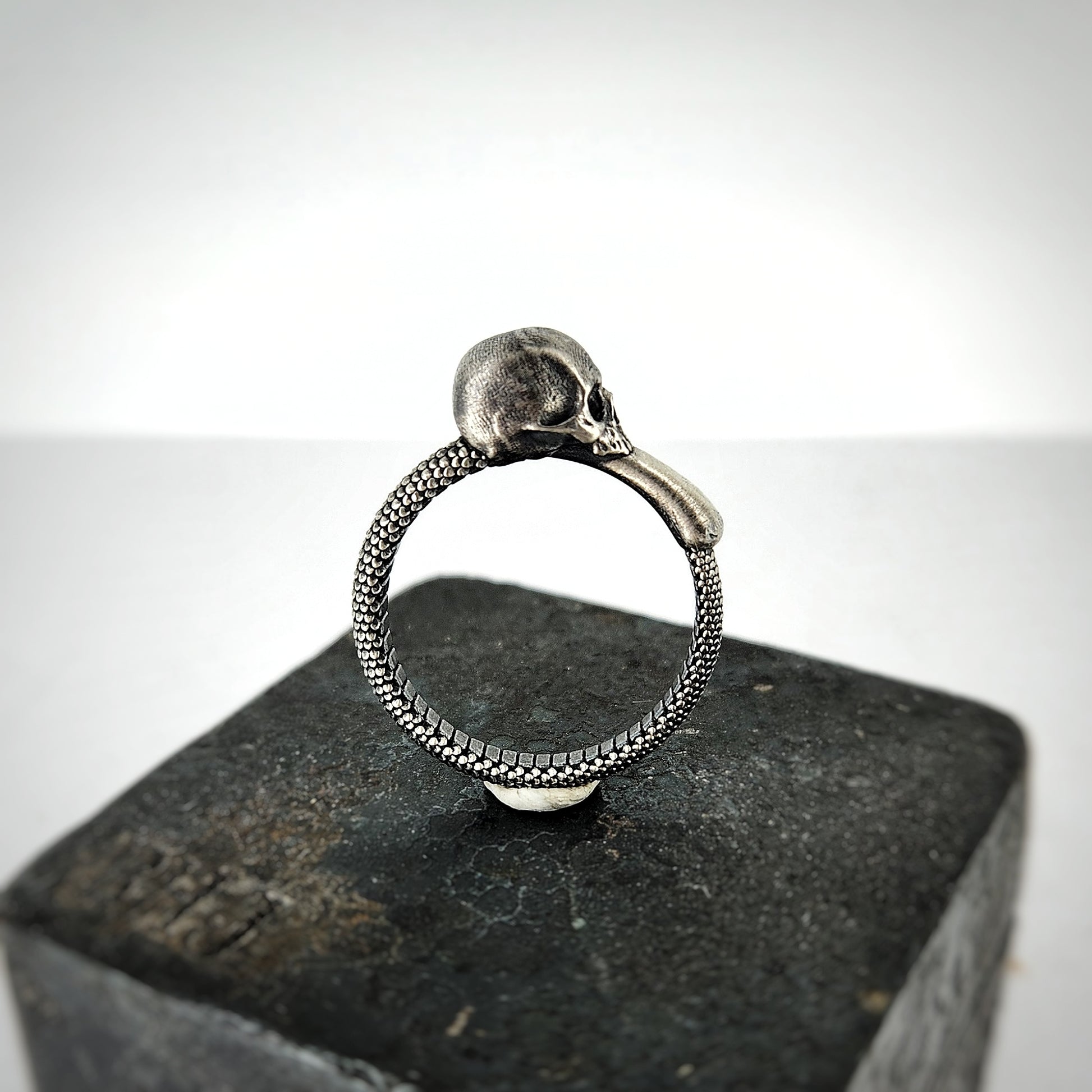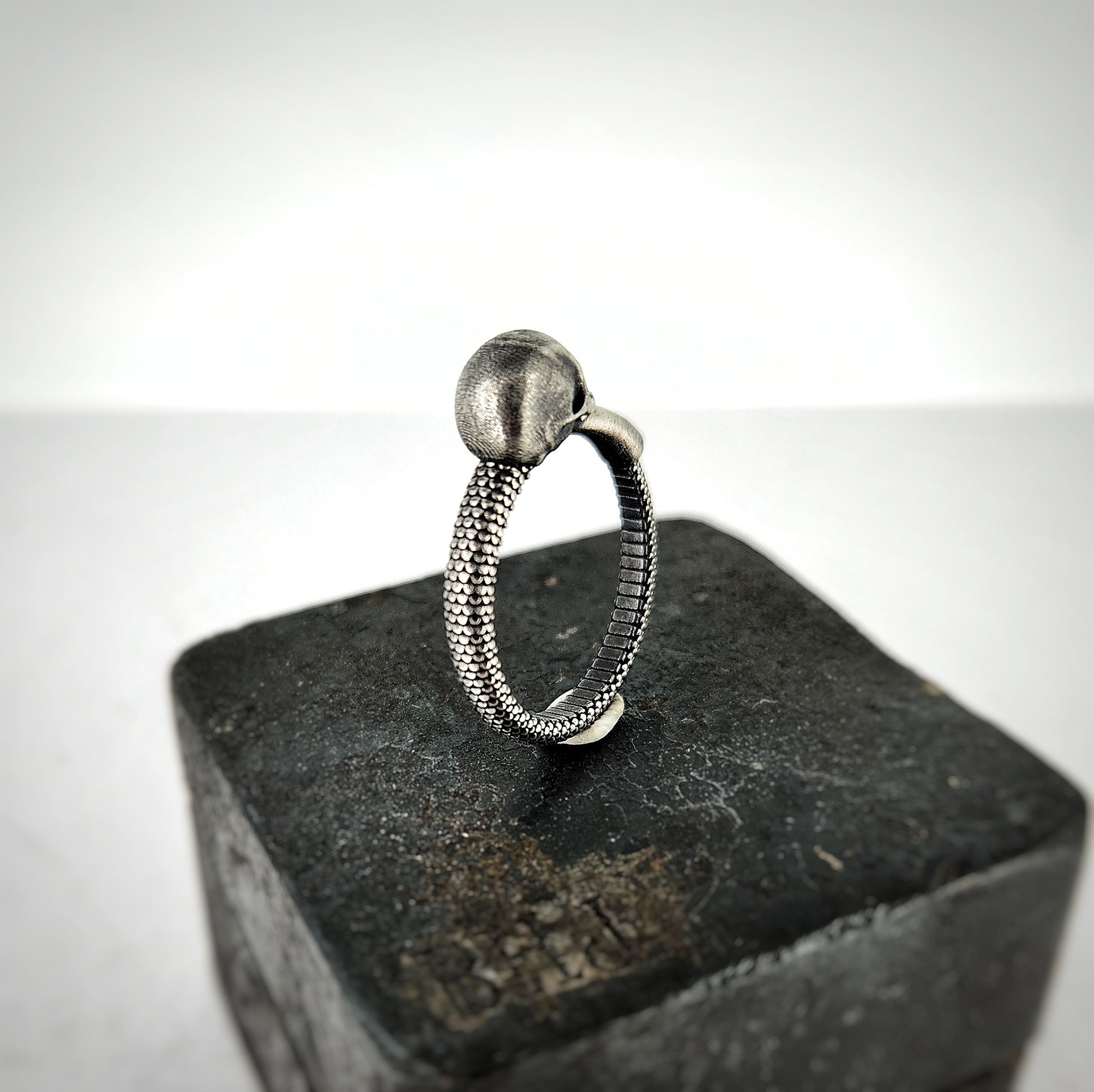 Each skull is meticulously rendered in sterling silver, capturing fine anatomical details that are enhanced by an antiqued finish. The ring's exterior showcases precisely crafted scales that create a mesmerizing pattern around the band, while the interior features refined ribbed detailing, adding both visual interest and structural integrity to the piece.
