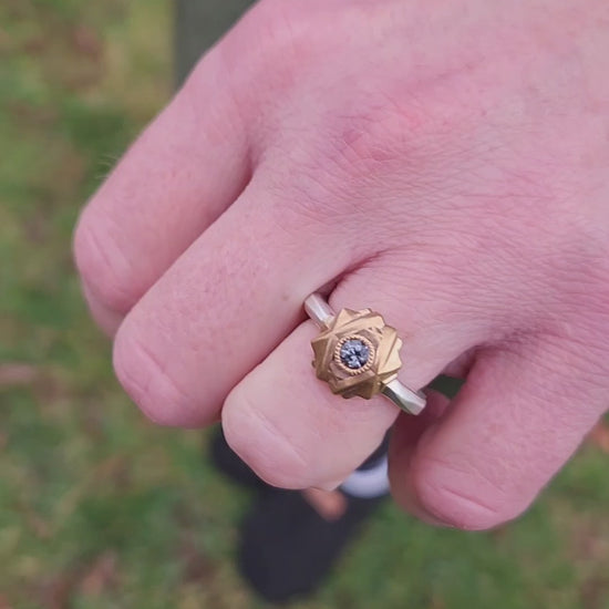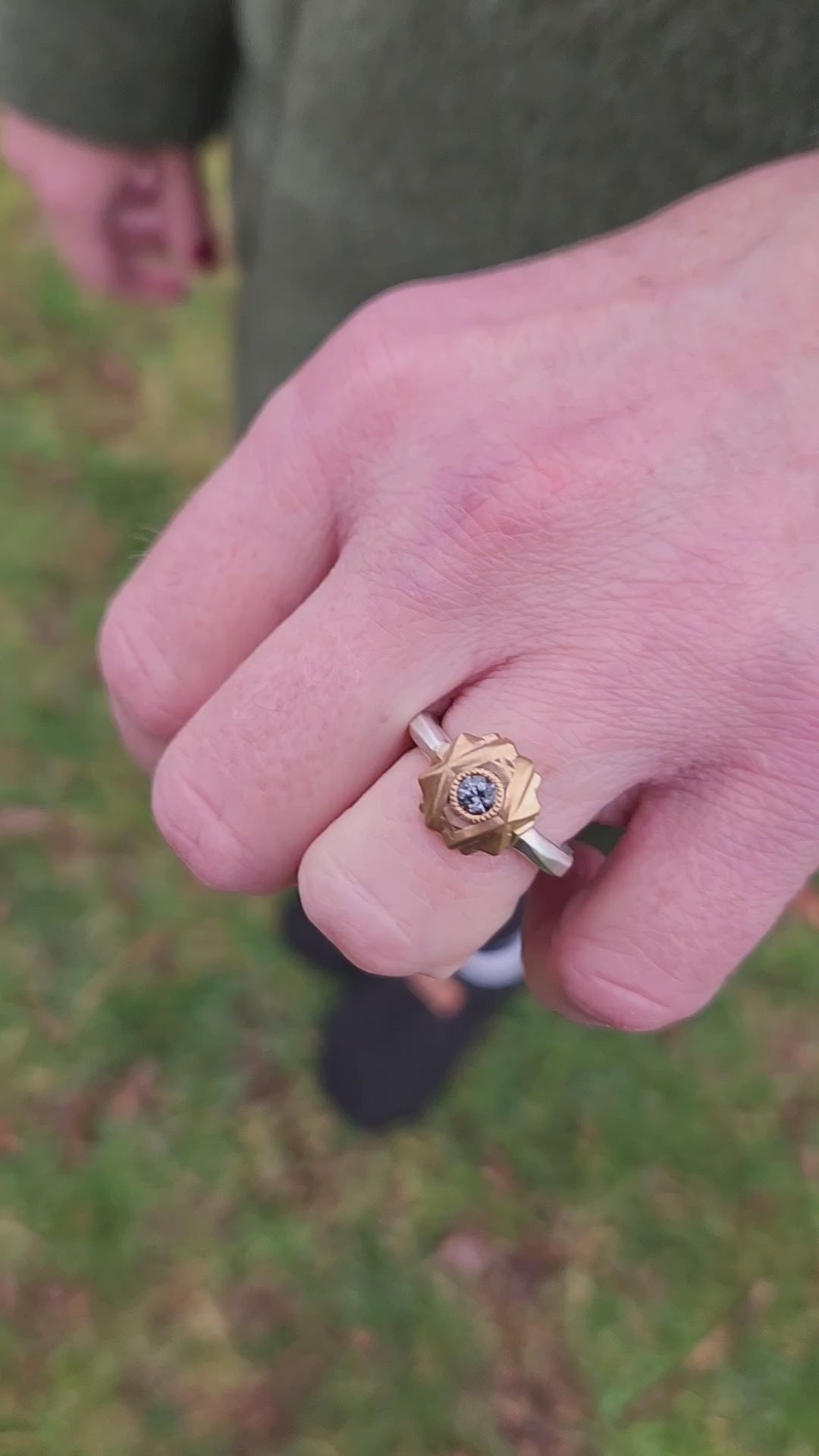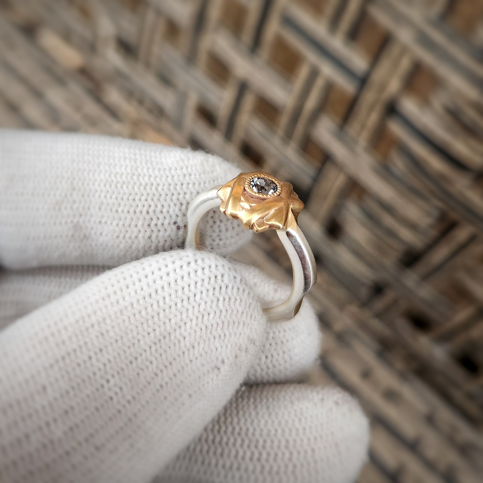 A stunning fusion of warm and cool tones, this handcrafted ring showcases exceptional metalwork and timeless design. The centerpiece features a sculptural gold-plated brass sunburst setting. At the center, a silver Spinel gemstone is secured in a delicate bezel setting, adding sparkle to the rich gold tones.