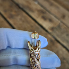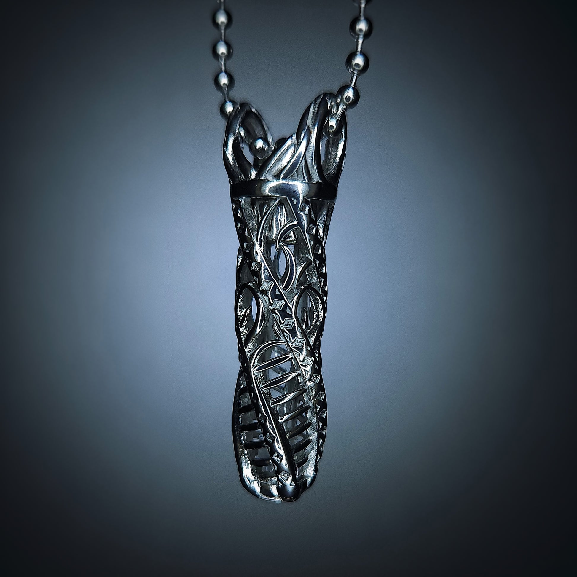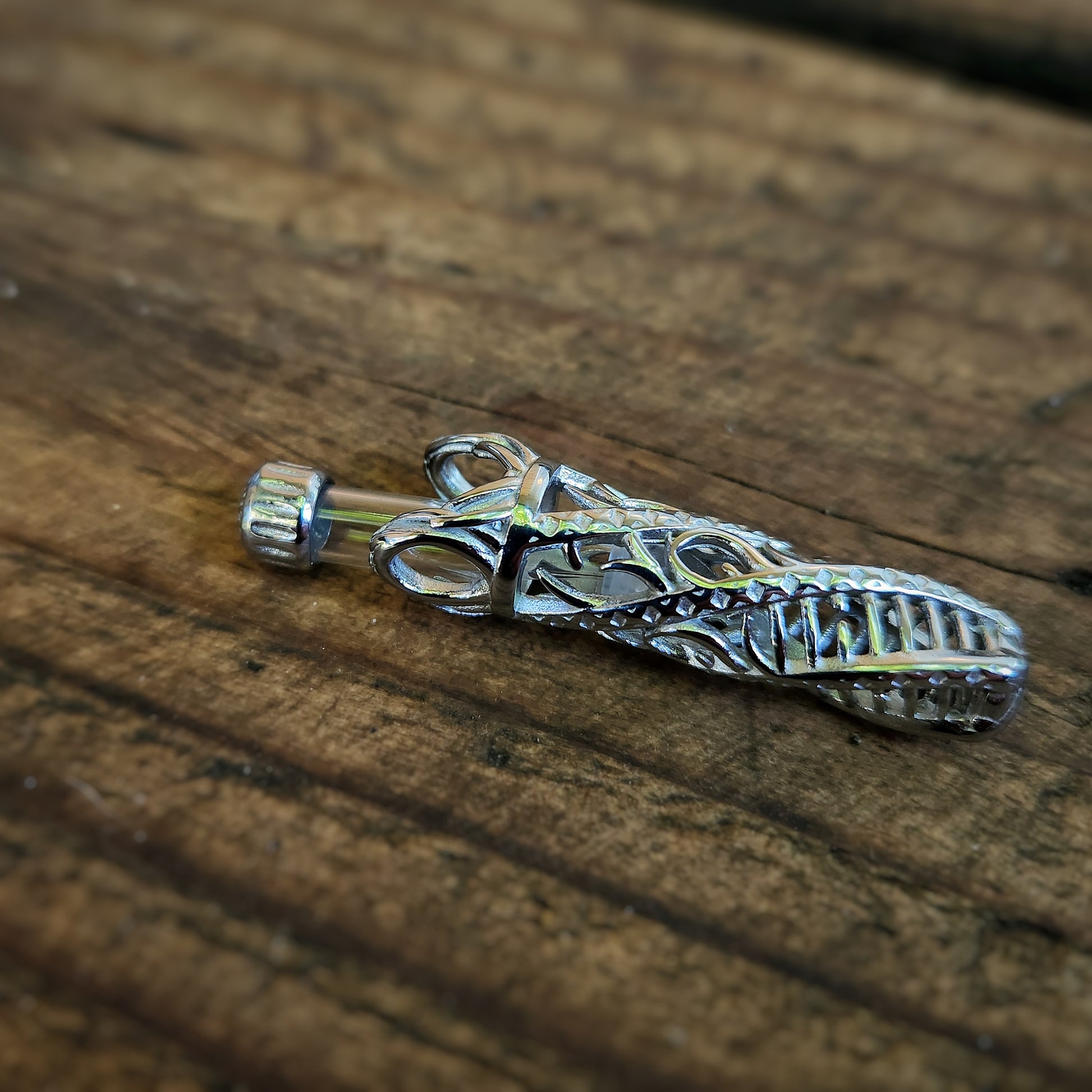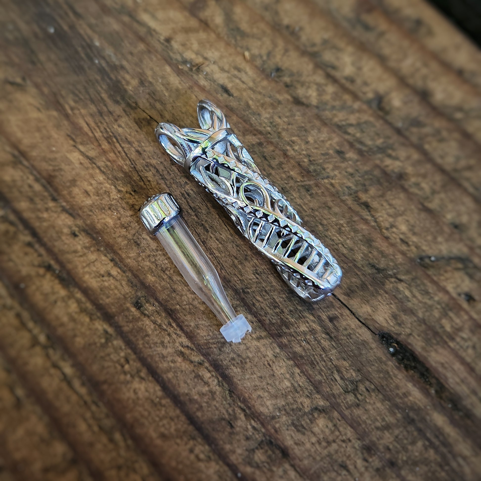 The design is such that when a chain is placed through the double bail, the vial and cap will never come out of the body of the pendant.