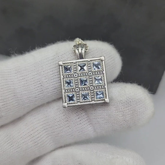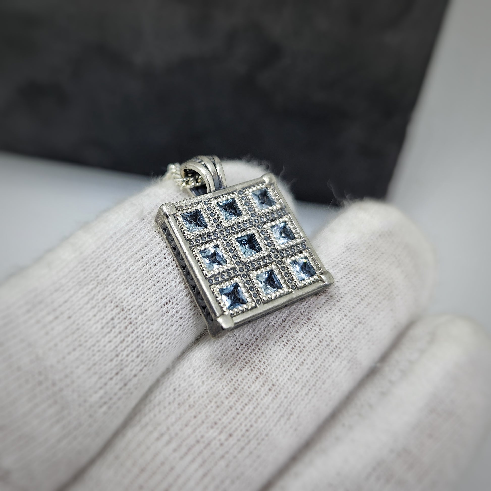 This particular Stratagem V.2 features: Aquamarines. These are set in my original sterling silver, antiqued and brush finished design.
