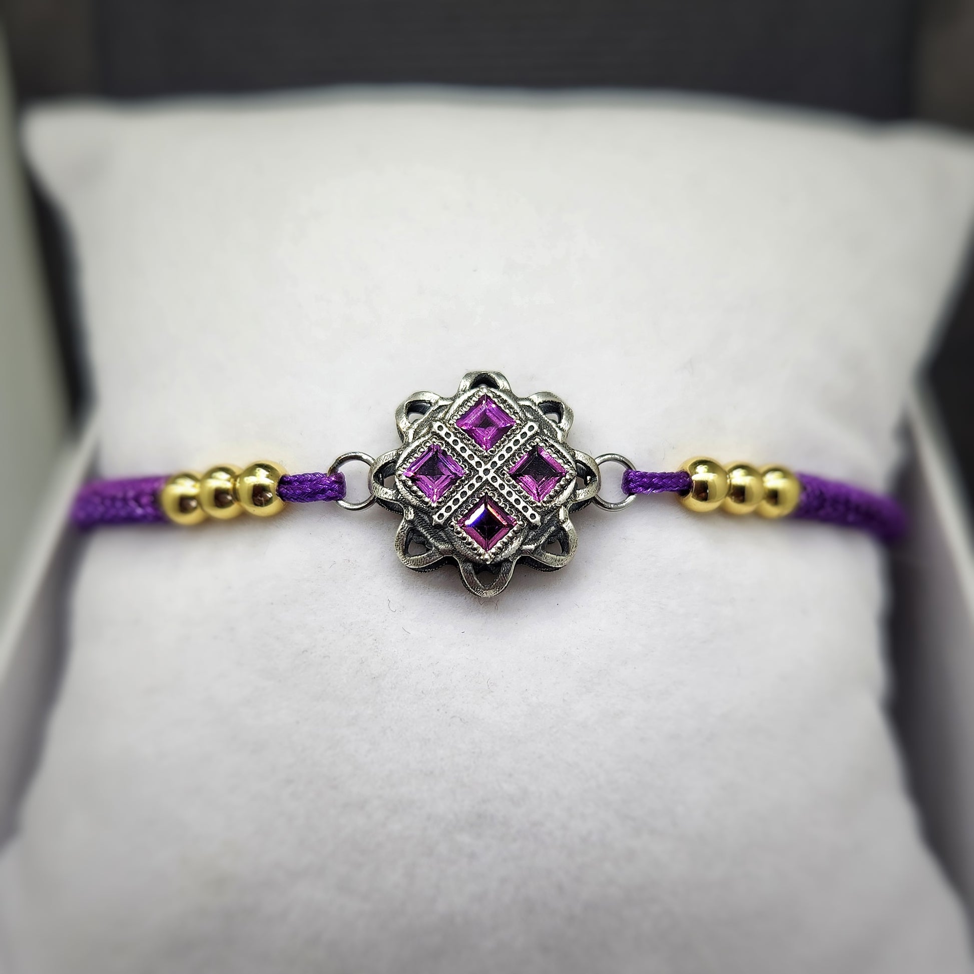 Elevate your everyday style with this exquisite sterling silver bracelet, featuring a detailed centerpiece adorned with four step-cut and princess-cut gemstones. Each gemstone adds a pop of brilliance, framed by an intricate design that showcases the intricate and geometric detailed craftsmanship. The adjustable colored nylon slide cord ensures a comfortable fit, with gold plated brass spheres to add a touch of elegance. Perfect for layering or wearing solo, this bracelet is a timeless piece that pairs elegance with everyday wearability.