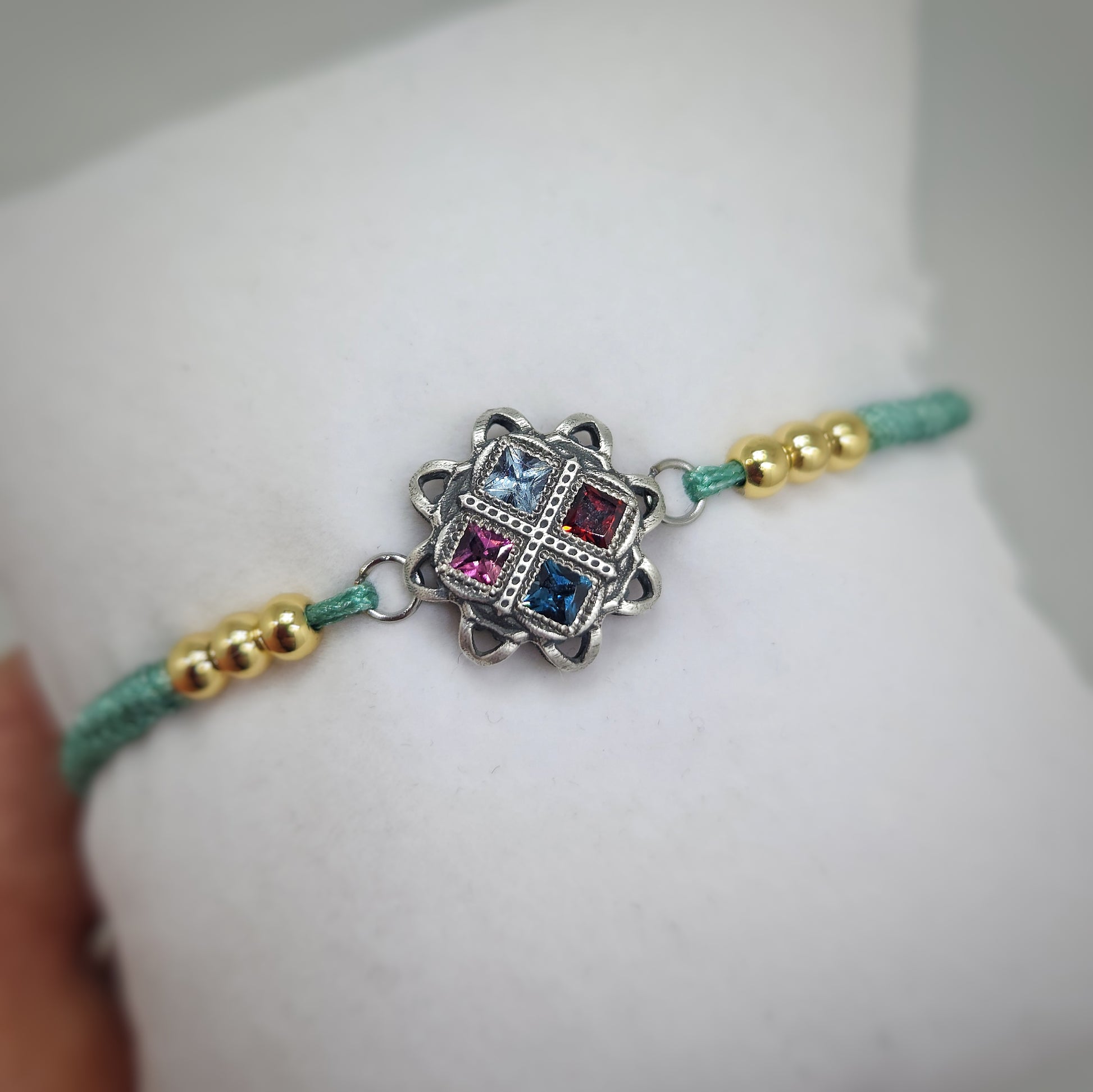Elevate your everyday style with this exquisite sterling silver bracelet, featuring a detailed centerpiece adorned with four step-cut and princess-cut gemstones. Each gemstone adds a pop of brilliance, framed by an intricate design that showcases the intricate and geometric detailed craftsmanship. The adjustable colored nylon slide cord ensures a comfortable fit, with gold plated brass spheres to add a touch of elegance. Perfect for layering or wearing solo, this bracelet is a timeless piece that pairs elegance with everyday wearability.