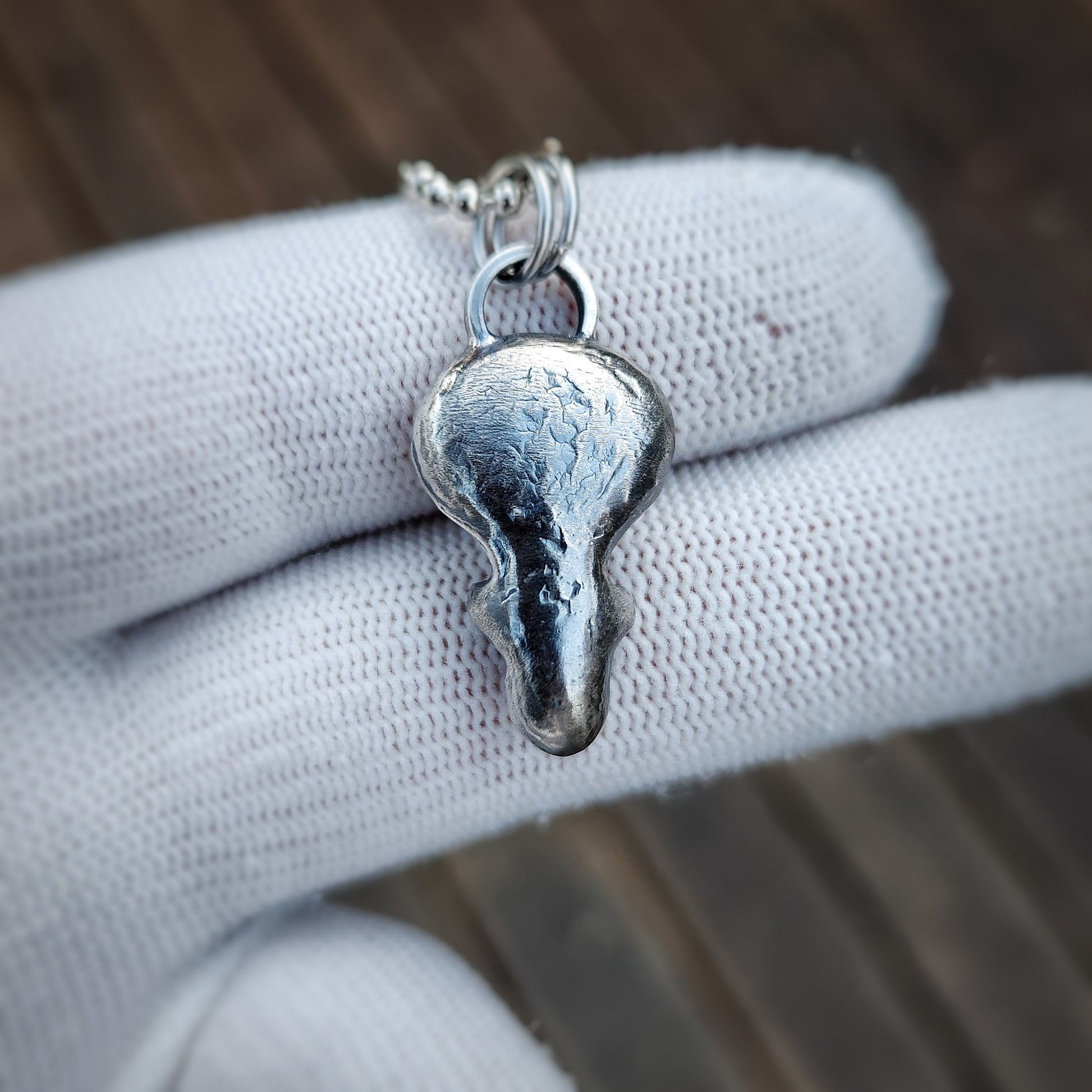 A Mysterious Visitor from the earliest lineage, hand poured from molten sterling silver and finished by hand. Each piece forms organically during the pour, resulting in subtle variations in shape and surface texture — no two are exactly alike. Simple, expressive, and quietly otherworldly, the Original Visitors mark the beginning of the collection and are meant to be worn as small, one-of-a-kind companions.