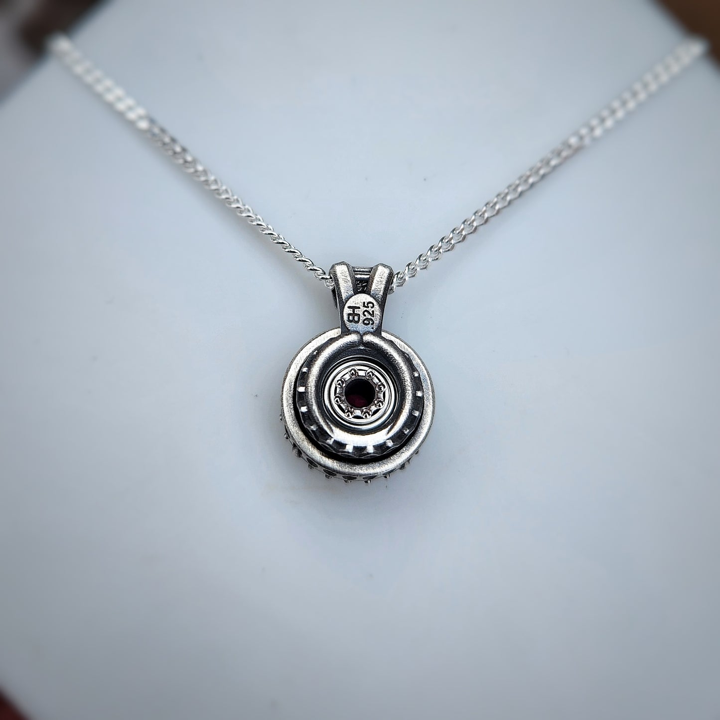 It is inspired by a futuristic nautical compass, and can spin via your hand, capturing the essence of exploration and adventure. This pendant is crafted with precision and care, featuring your choice of gemstone: red Spinel, Rhodolite Garnet or Black Onyx. These vibrant stones add a touch of elegance, making this pendant a perfect blend of modern design and timeless beauty. Ideal for those who seek direction in style.