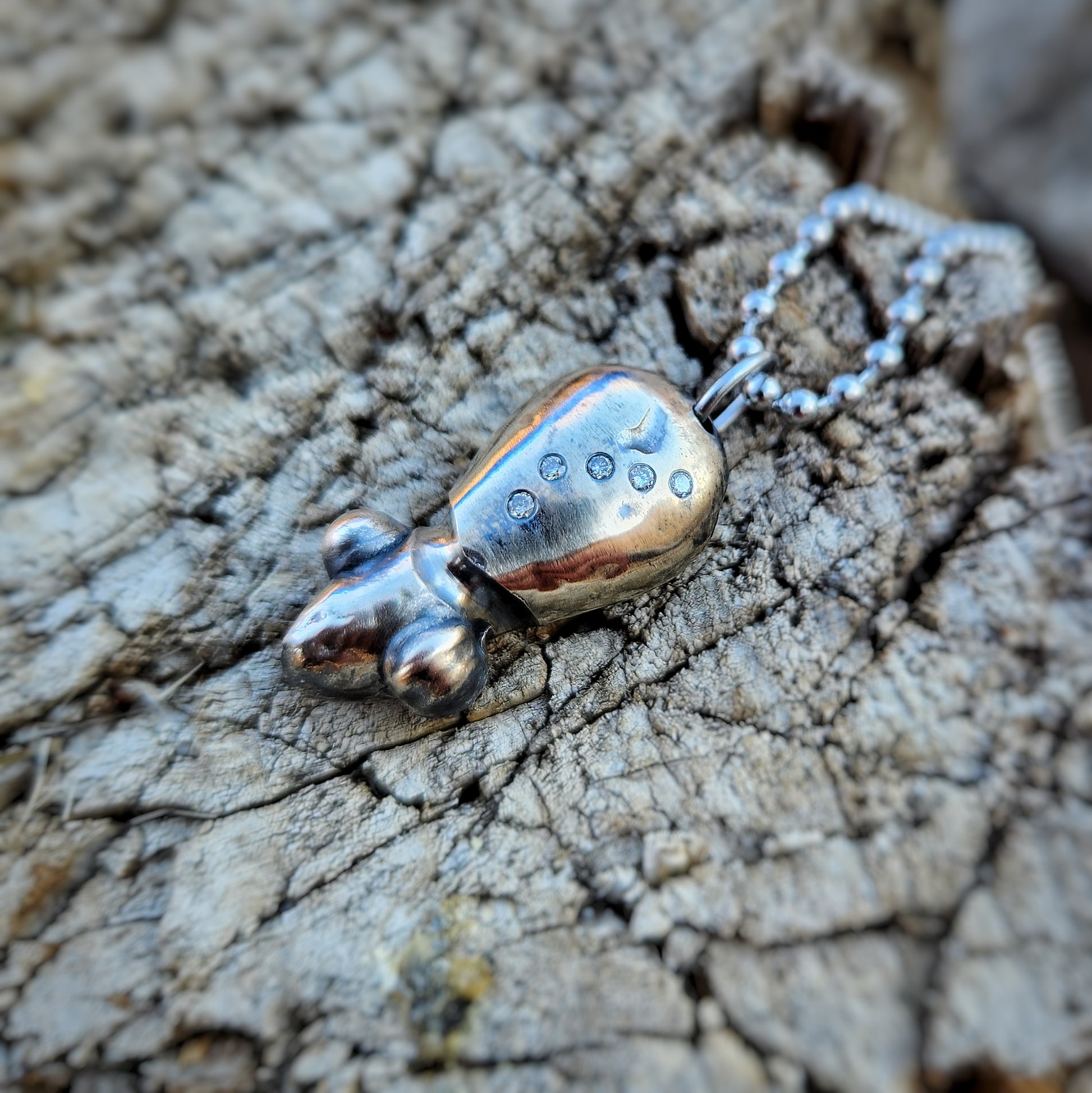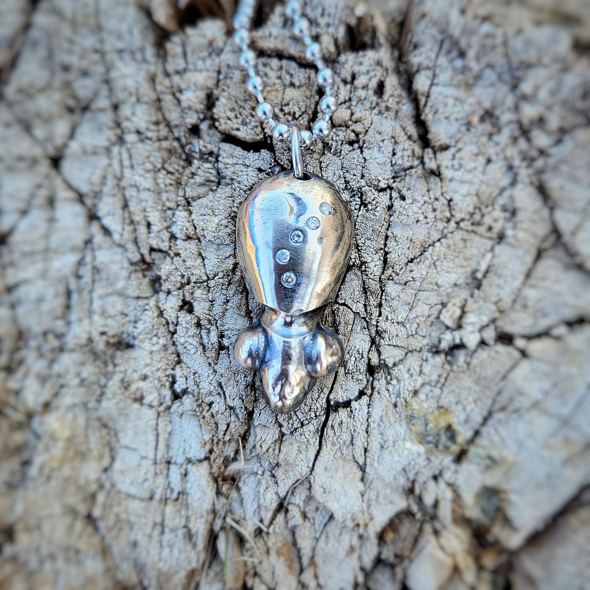 A small, hand-poured Visitor crafted from Ben’s secret metal mix — no two are the same. Each piece is set with hand-picked gemstones and brush finished to show the metal’s natural depth and patina. Worn on a short chain or added to a charm cluster, this Visitor is a tiny companion with a particular piece of wisdom to share.