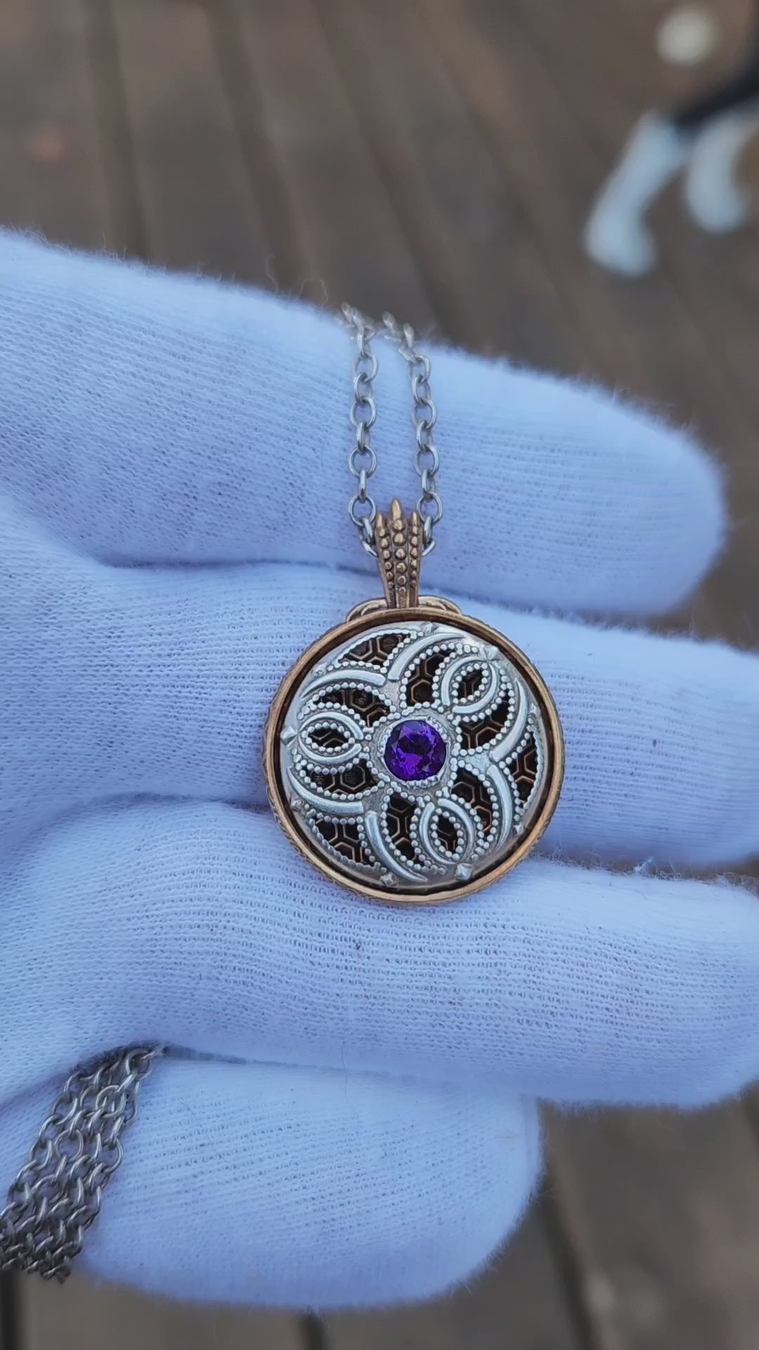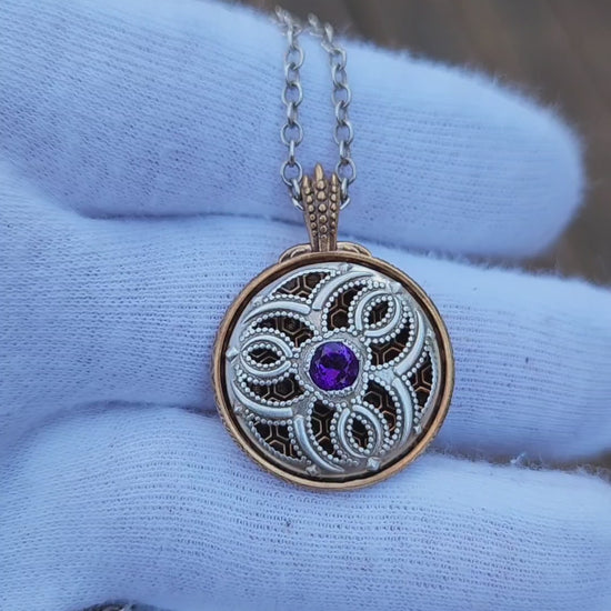 This pendant features an amazing amethyst set in antiqued and brush finished sterling silver. The back piece is brush finished bronze.