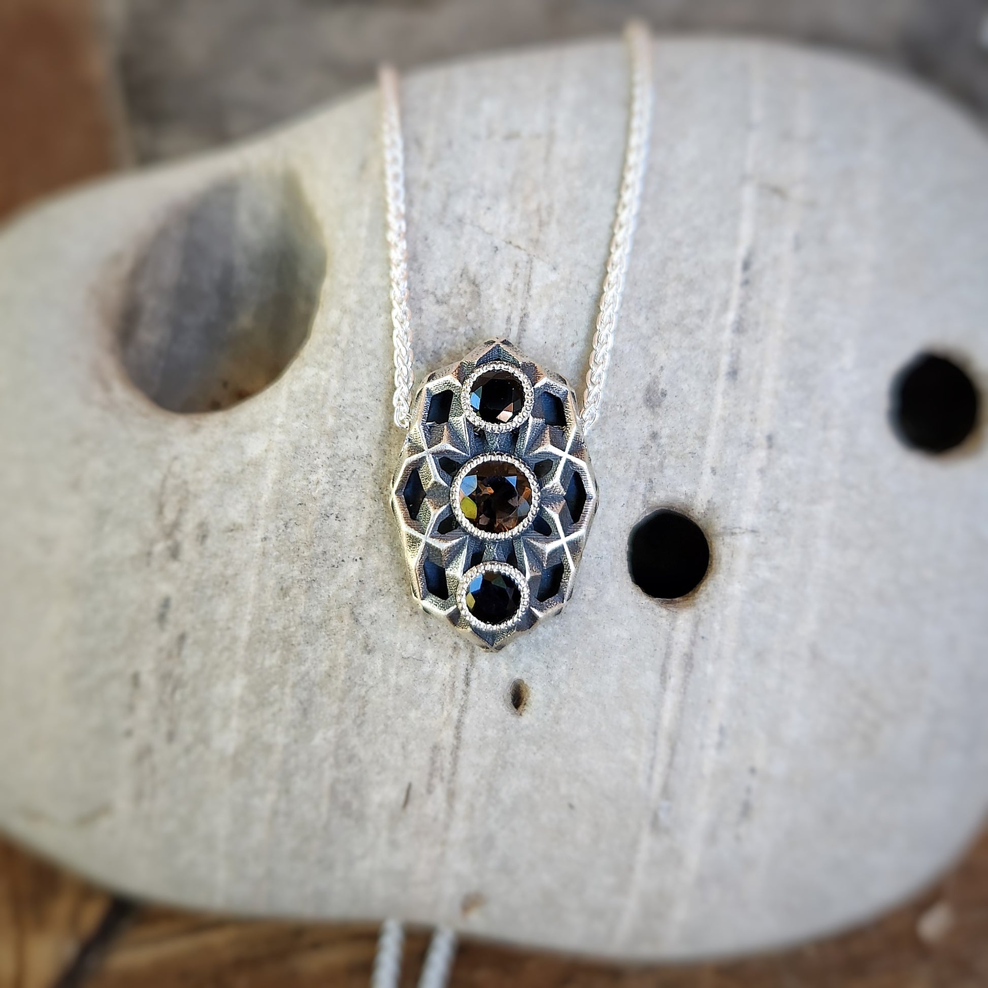 Each pendant is meticulously forged in sterling silver, featuring intricate geometric detailing that catches the light from every angle. The design is finished with a softly antiqued patina to highlight depth and texture, giving it a timeless, heirloom quality. Three hand-picked and set gemstones adorn each piece. Suspended from a sterling silver chain, this piece balances elegance with a distinct artisanal character—refined yet unmistakably handcrafted. Options include: