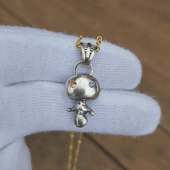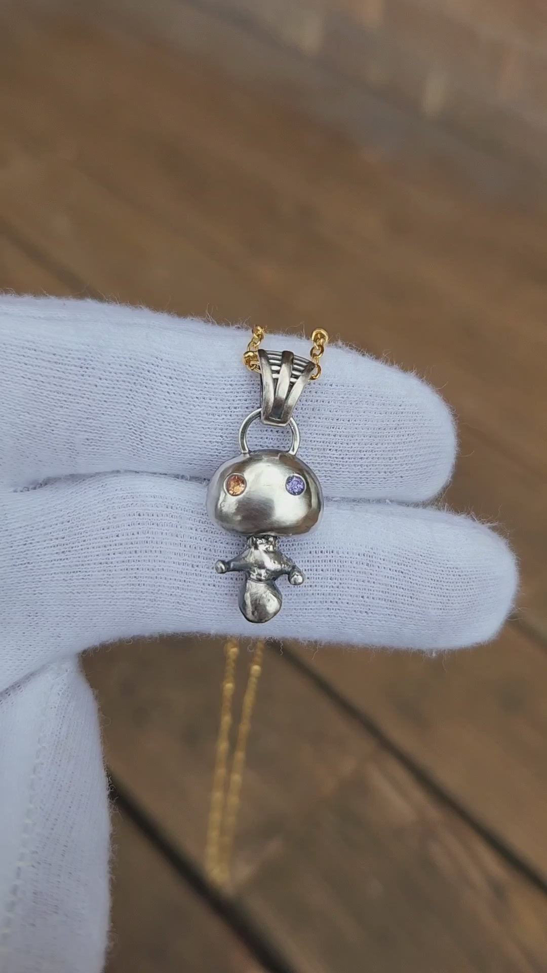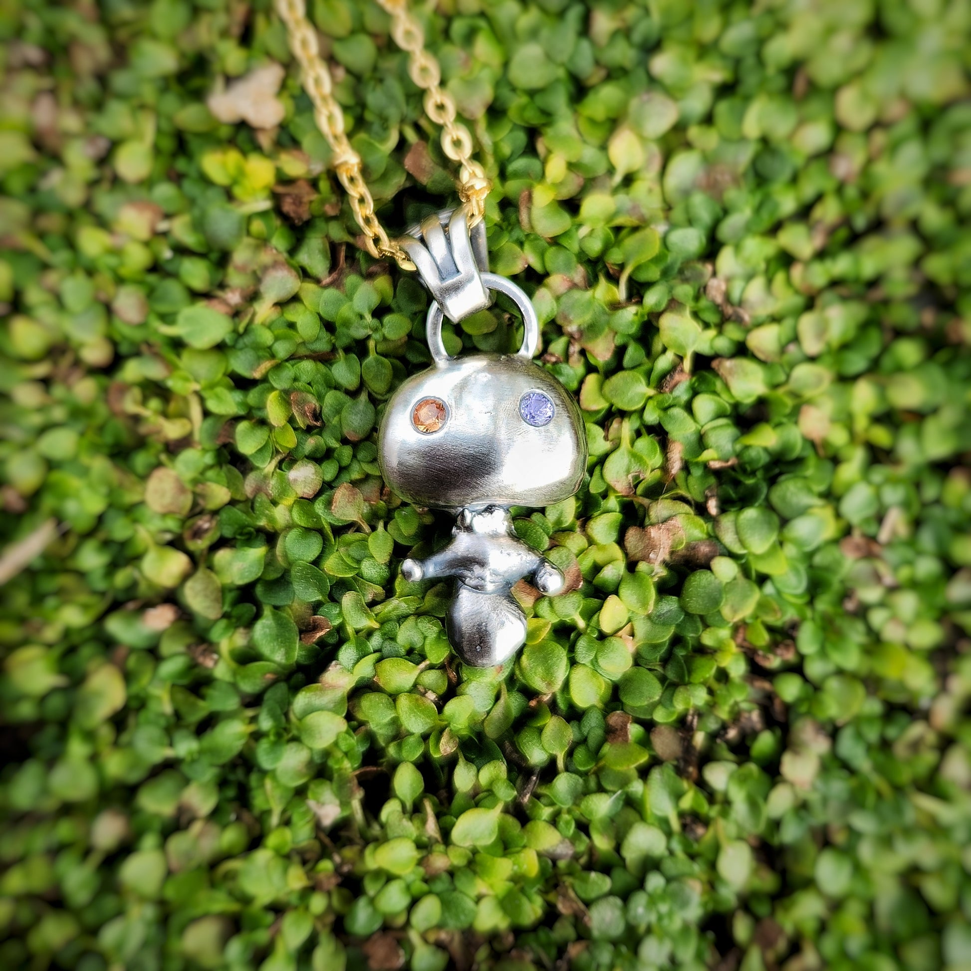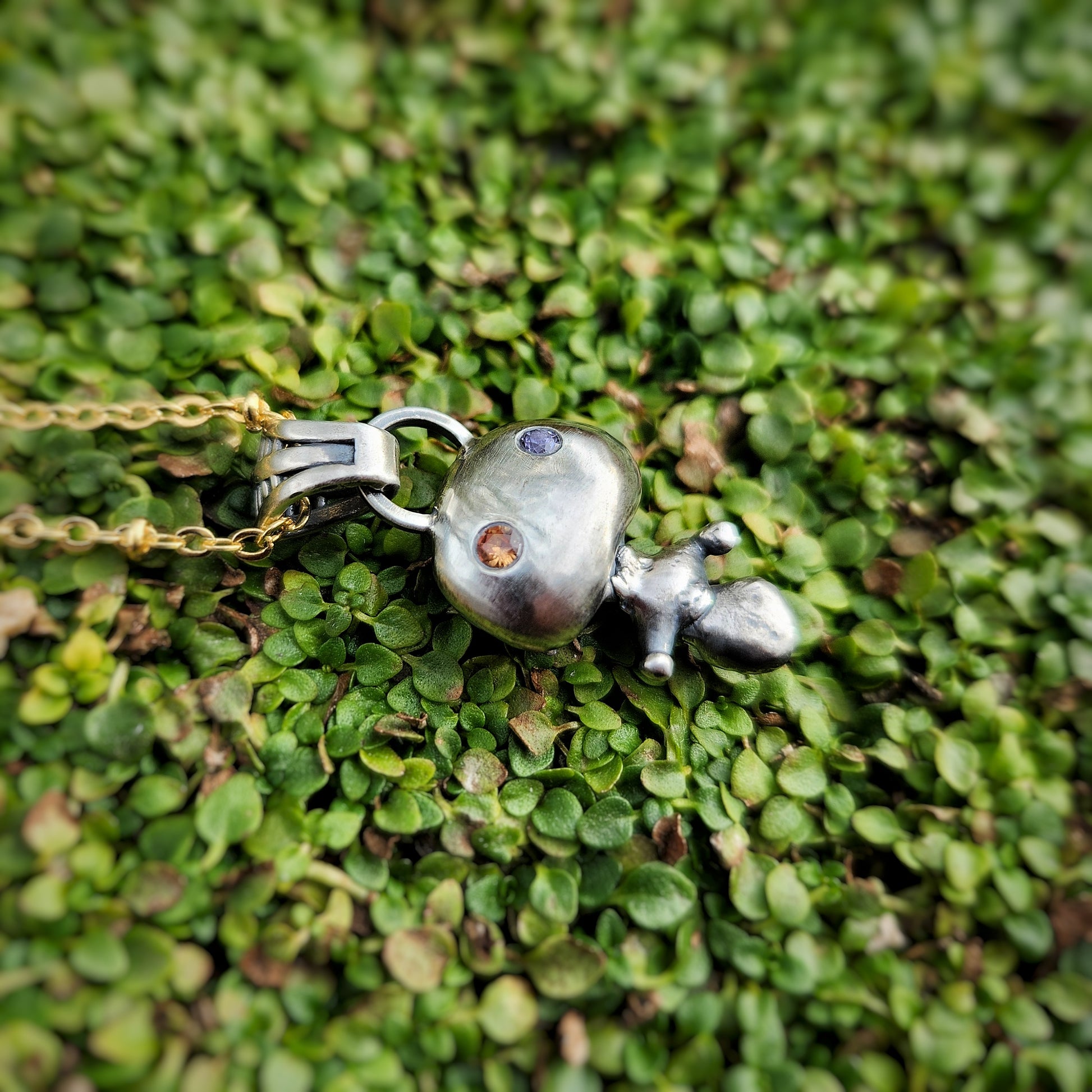 I knew right away I had to do something fun with him, as I could not stop holding and staring. I cleaned him up, while leaving his natural forms front and back. Set a tangerine and lavender sapphire for his eyes under my scope, made him a bail and finished him off with a brushed antique finish!