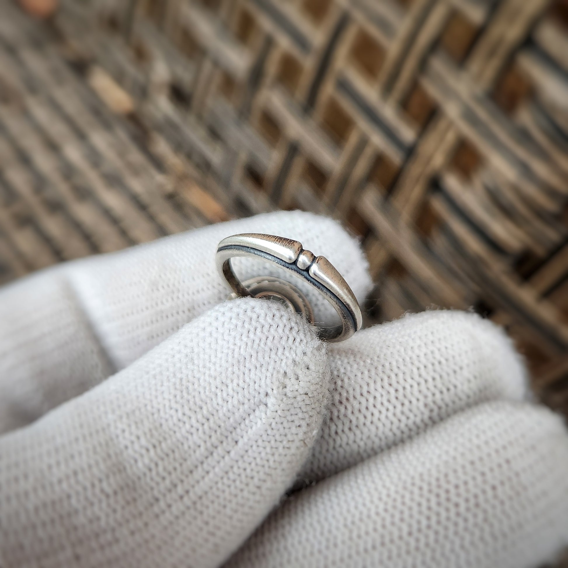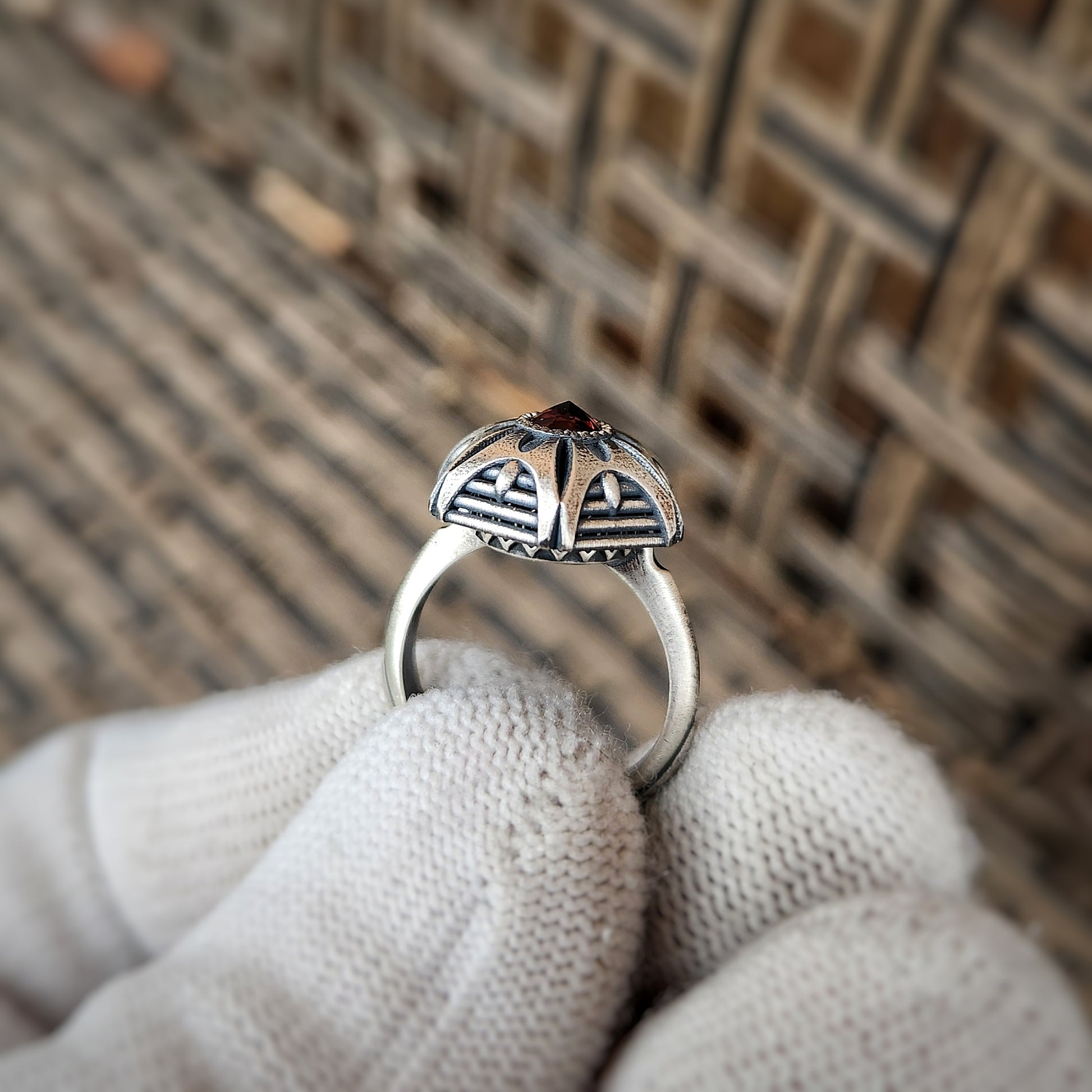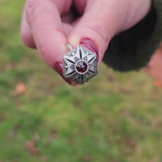 Add a bold, celestial touch to your jewelry collection with this handcrafted sterling silver ring. Inspired by star-like geometry, this design features intricate details and a brushed, antiqued finish that highlights its unique character. The spinning centerpiece is adorned with a reverse set Red Garnet—making it both eye-catching and interactive. This B. Harju Original piece is perfect for anyone seeking elegance with a playful twist.
