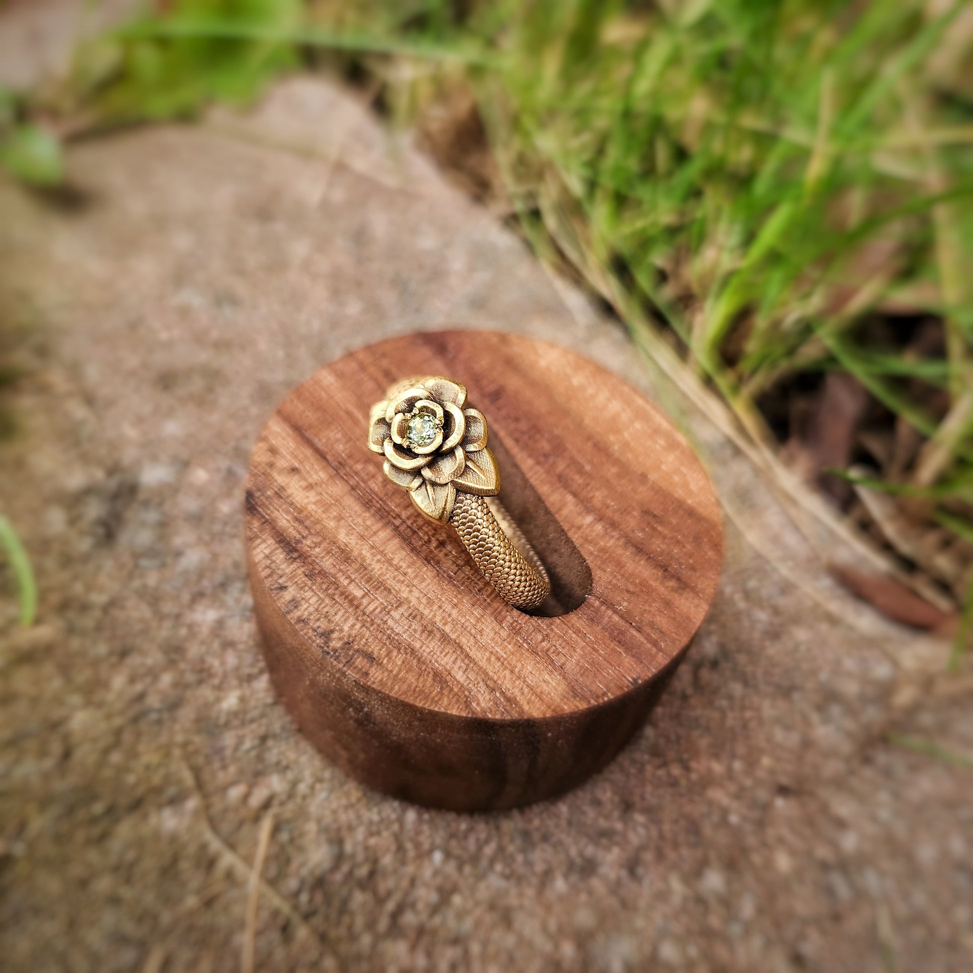 This nature-inspired ring features a sculpted blossom with layered petals and a scale textured band, creating an organic, botanical look that’s both elegant and easy to wear. Each ring highlights a sparkling center stone, bringing the flower design to life with a vivid pop of color.