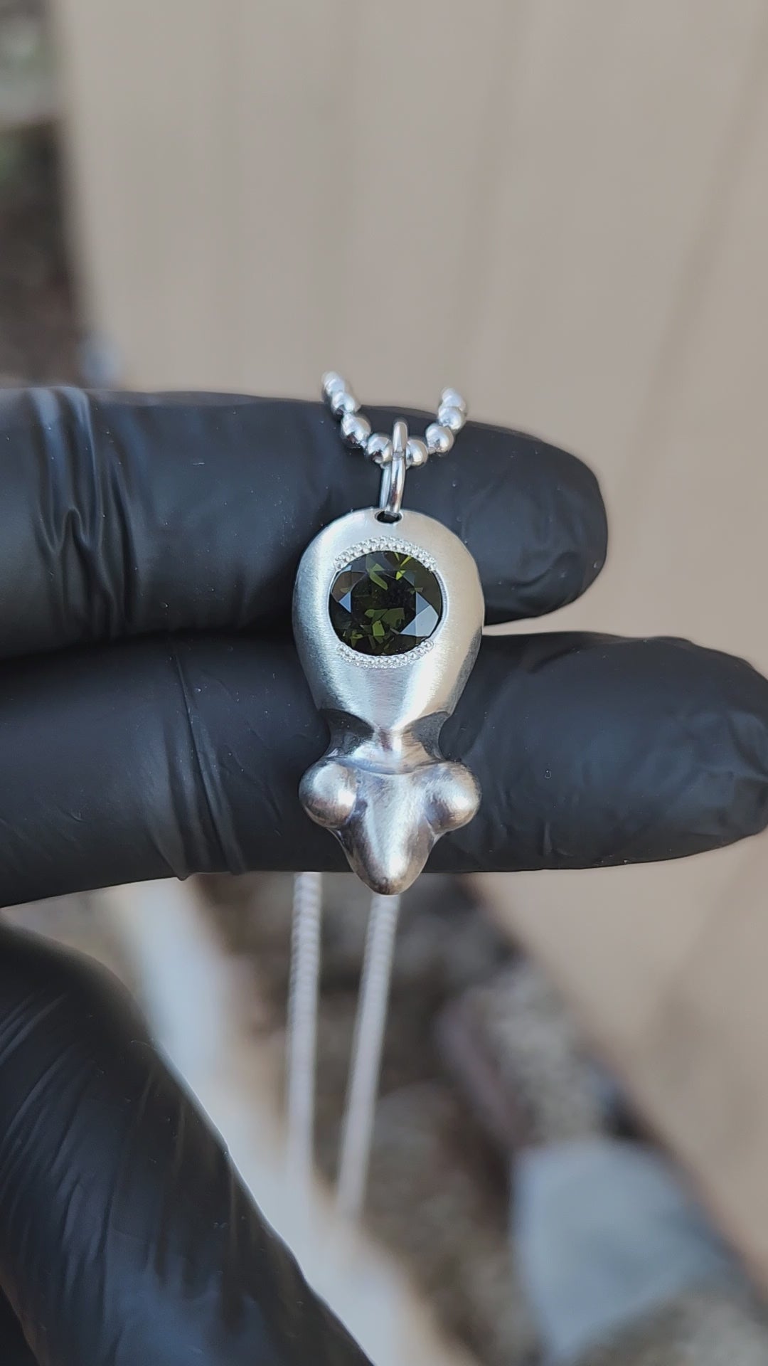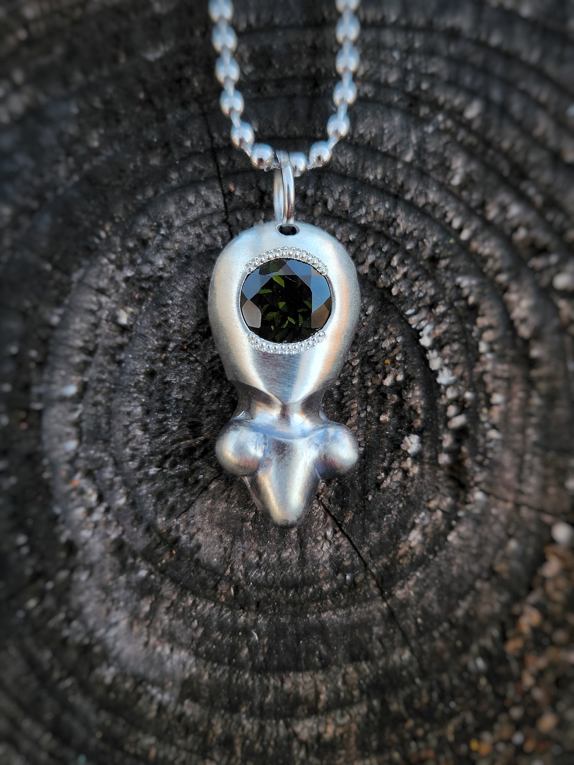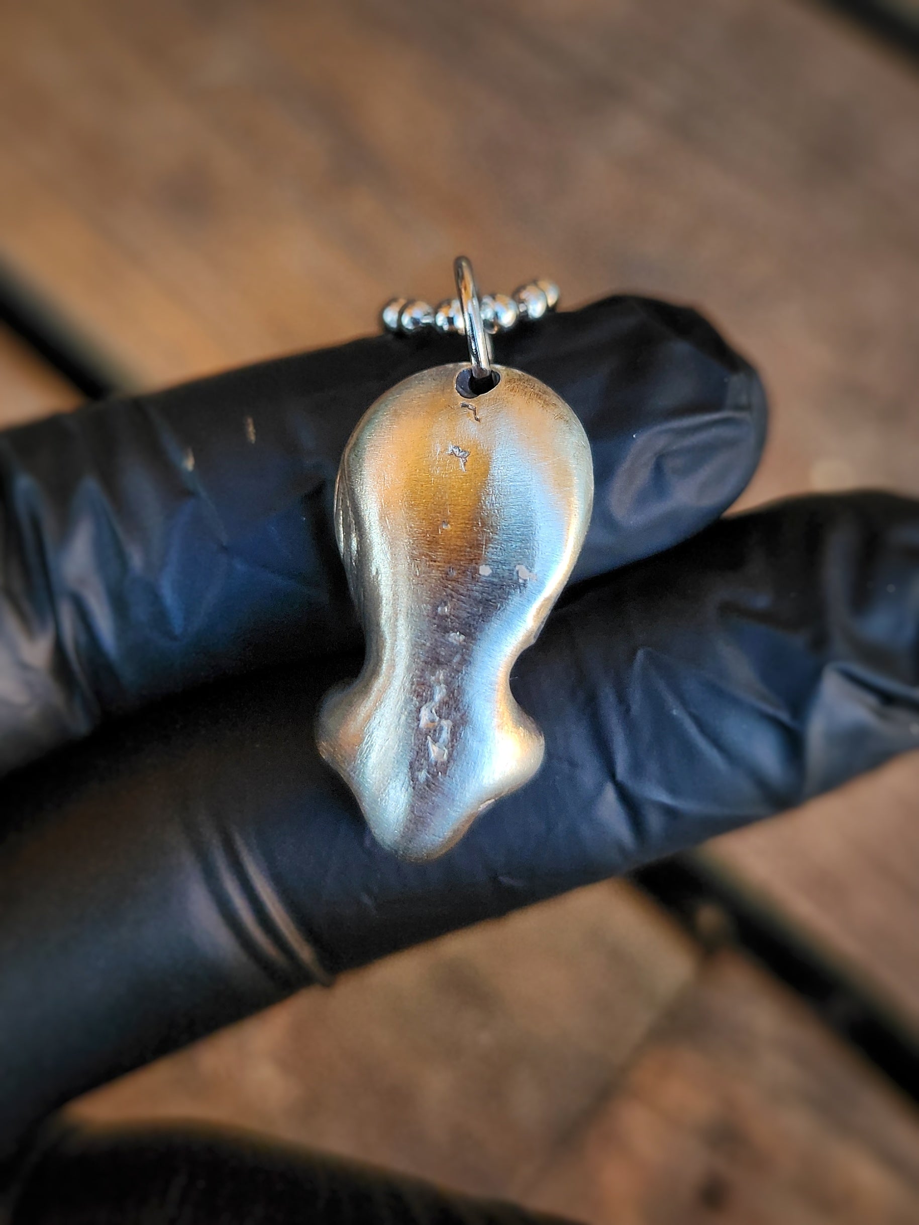 A Singular Visitor, hand poured from molten sterling silver and finished by hand. Each piece forms organically during the pour, resulting in subtle variations in shape and surface texture — no two are exactly alike. Simple, expressive, and quietly otherworldly, the Visitors are meant to be worn as small, one-of-a-kind companions.