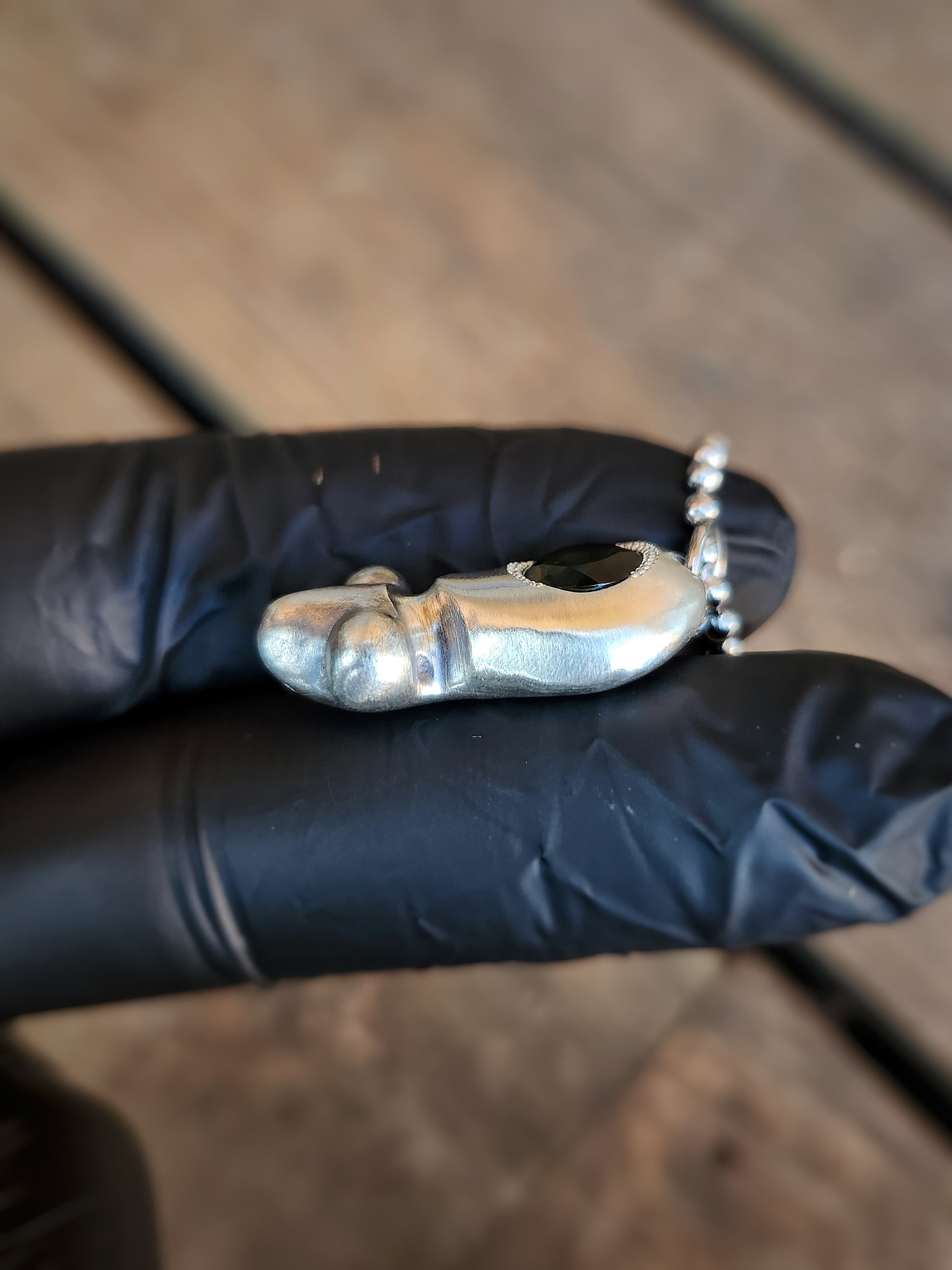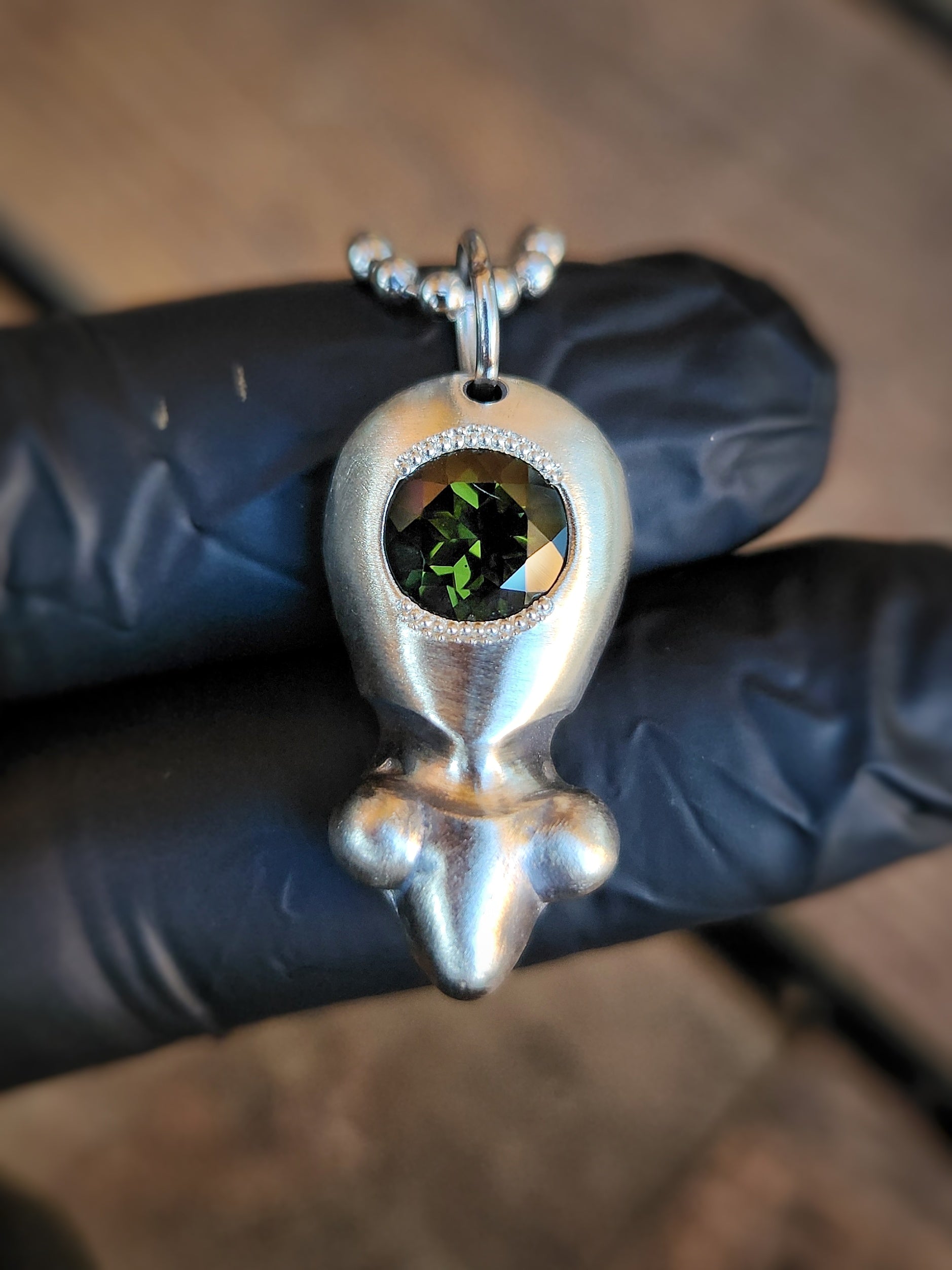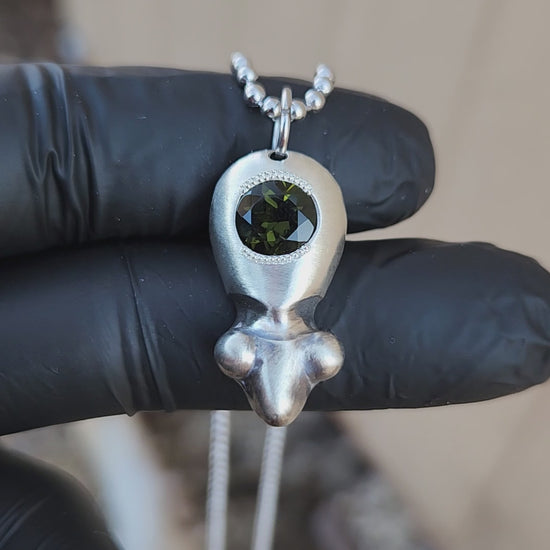 A Singular Visitor, hand poured from molten sterling silver and finished by hand. Each piece forms organically during the pour, resulting in subtle variations in shape and surface texture — no two are exactly alike. Simple, expressive, and quietly otherworldly, the Visitors are meant to be worn as small, one-of-a-kind companions.