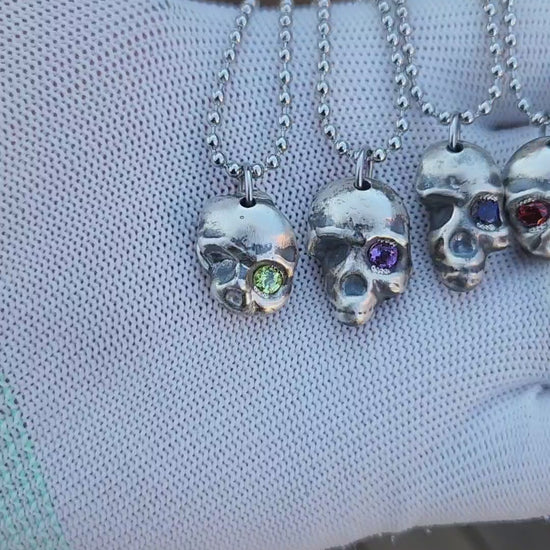 Each skull pendant comes ready to wear on a 24" stainless steel ball chain that complements the industrial-organic aesthetic of the silver.